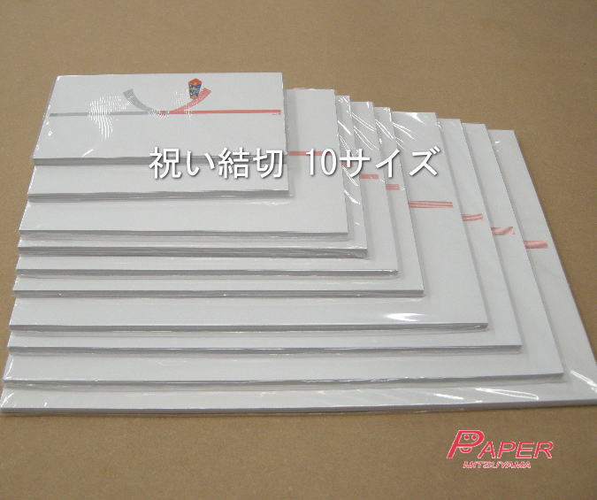 1冊=100枚入り 紙質:上質紙(65g/m2) ●インクジェット・レーザープリンター対応 2-366はプリンターの機種によって、プリントできない場合があります。 婚礼お祝用(十本結切)プリンター対応のし紙の基本知識 婚礼お祝用(十本結切)プリンター対応のし紙とは婚礼お祝用(十本結切)のし紙は、婚礼のお祝いの祝賀品やお祝い返しの引き出物に用いられています。向って右側が「赤色」、左側が「銀色」の10本の水引が印刷されています。インクジェットプリンター・レーザープリンター共に対応しており、表書きは印刷いただけます。サイズは中杉判(反物判)から豆判8号まで幅広く取り揃えておりますのでお好きなサイズを選んでいただけます。のし紙をかける品物の大きさに合わせてお選びください。 【同一商品ゆうパケット同梱可能数】 1点までゆうパケット対応婚礼お祝用(十本結切)プリンター対応のし紙の使い方 婚礼お祝用(十本結切)プリンター対応のし紙のマナーのし紙は包装紙と同じように「表」と「裏」があり、表側には「水引」や「のし」が印刷されています。のし紙を包む際は、「のし」を右上にして包みます。結婚式の引き出物には「寿」、結婚式には、出席しなかった人からのお祝いのお返しには『内祝』や『結婚内祝』と表書きに書きます。ご結婚をお祝いする場合の表書きには、「御結婚御祝」が良いでしょう。また、結婚をするご本人たちが名前を書く際には、送り主の箇所に名前を書く順番が決まっており、右側が新郎さま、左側が新婦さまと連名になります。婚礼お祝用(十本結切)プリンター対応のし紙の使い方の例水引中央の結び目は「結切り」と称される丸結びになっており、固く結ばれ解けない(離れない)事が願われています。のし紙は、ただ単に贈答品を包むためだけでなく、水引のその本数や色、また結び方により、深い意味合い、想いが込められています。婚礼時に使用されるこちらの10本水引は、結ばれる本人達と両家が手を結びあって縁結びをする形を表しているとも言われています。最後にのし紙の掛け方ですがのし紙の使い方で「内のし」と「外のし」と2種類があります。内のしは、包装紙を開けた時に出てくるように、包装紙の中にのしを掛けます。一方、外のしは、包装紙の上にのしを掛けるので、贈り物を受け取った時にすぐに確認できるようにします。 商品番号一覧 サイズ品番 中杉(反物)判314×448mm2-702 A3判297×420mm2-700 みの判270×390mm2-703 B4判257×364mm2-704 半紙判224×340mm2-705 A4判210×297mm2-706 本中(切手)判195×270mm2-707 サイズ品番 B5判182×257mm2-708 A5判148×210mm2-709 B6判128×182mm2-710 豆判8号120×210mm2-718 横長中207×448mm2-366 横長小176×385mm2-365