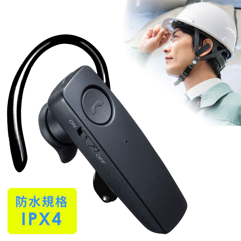 作業現場で汗をかいても急な雨が降っても安心して使える防水Bluetooth片耳ヘッドセット。テレワーク、Zoom会議にも対応。※箱にキズ、汚れがありますが商品は新品です。<特長>●Bluetooth 5.2に対応しています。●IPX4の防水機能搭載なので汗をかいたり急な雨が降っても使えるヘッドセットです。●耳をふさがないイヤーピースなので、外の音も聞こえて安全に使用できます。●イヤーフックを外して付け替えなくても右耳と左耳の付け替えが可能なイヤーフック一体型のヘッドセットです。●電源のON/OFFはスライドスイッチで簡単に操作が可能です。●電源を入れると自動的にペアリングモードになるので初めての方でもスムーズに機器とのペアリングが可能です。●充電ポートに水が入るのを防止するポートカバー付きです。●音量調節や曲送り・曲戻しなどの操作も可能です。<仕様>■適合規格:Bluetooth 5.2(class 2)■伝送方式:GFSK■周波数範囲:2.402〜2.480GHz■通信距離:最大約10m※実際の通信距離や使用時間は理論値です。使用環境や使用状況によって異なります。■対応コーデック:SBC■マルチポイント:対応■電源:リチウムポリマーバッテリー充電時間/2時間連続再生最大時間/12.5時間連続通話最大時間/8.5時間連続待受最大時間/130時間※上記は理論値です。実際の使用時間は使用環境や使用状況によって異なります。■充電ポート:microUSB■対応プロファイル:HFP、A2DP、AVRCP■再生周波数帯域:20〜20000Hz■マイク感度:-44±2dB、f=1KHZ■マイク指向性:無(全)指向性■防水規格:IPX4■サイズ:約W54×D62.5×H23.5mm■重量:約11g■セット内容:本体、充電用USBケーブル■保証期間:ご購入日より6ヶ月■取扱説明書:日本語取扱説明書あり■対応機種:Bluetooth対応のスマートフォン・携帯電話・パソコン・オーディオ機器※HSP/HFP(ハンズフリー通話機能)に対応していること。※音楽再生の場合は、A2DP(音楽再生)に対応していること。※パソコンがBluetoothに対応していない場合はBluetoothUSBアダプタをお使いください。※Bluetooth Ver4.2/4.1/4.0/3.0/2.1/2.0/1.2対応機器との接続も可能です。※Class1の機器との接続も可能です。対応確認済機種の一部はこちら ・ ASUS Chromebook CX34 Flip(CX3401) ・ iPad 10.2インチ 第7世代(2019) ・ iPad 10.2インチ 第8世代(2020) ・ iPad 10.2インチ 第9世代(2021) ・ iPad 10.9インチ 第10世代(2022) ・ iPad 9.7インチ 第6世代(2018) ・ iPad Air 10.9インチ 第4世代(2020) ・ iPad Air 第3世代(2019) ・ iPad mini 第5世代(2019) ・ iPad mini 第6世代(2021) ・ iPad Pro 11インチ 第1世代(2018) ・ iPad Pro 11インチ 第2世代(2020) ・ iPad Pro 11インチ 第3世代(2021) ・ iPad Pro 11インチ 第4世代(2022) ・ iPad Pro 12.9インチ 第3世代(2018) ・ iPad Pro 12.9インチ 第4世代(2020) ・ iPad Pro 12.9インチ 第5世代(2021) ・ iPad Pro 12.9インチ 第6世代(2022) ・ iPhone 16 ・ iPhone 16 Plus ・ iPhone 16 Pro ・ iPhone 16 Pro Max ・ MacBook Air 15インチ(2023) ・ Surface Pro 10<関連キーワード>MM-BTMH41WBKN Bluetooth ヘッドセット 防水 片耳タイプ テレワーク 会議 作業現場 IPX4 雨 汗片耳タイプラインナップ通話:約7時間通話:約8.5時間通話:約12時間通話:約12時間通話:約5時間