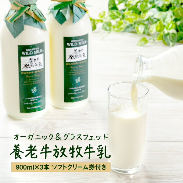 【ふるさと納税】オーガニック&グラスフェッド養老牛放牧牛乳900ml×3本 《ソフトクリーム券付き》 | グラスフェッド 牛乳 牛乳瓶 有機JAS認証 低温殺菌 乳製品 健康志向 安心 安全 栄養豊富 化学肥料不使用 輸入穀物不使用 お取り寄せ 北海道 中標津町 中標津【1300101】
