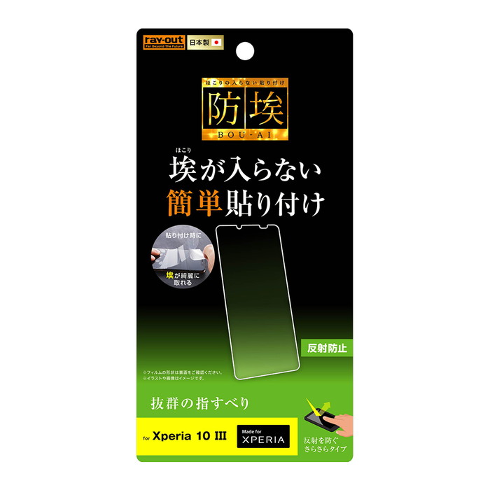 【商品説明】 ズレずに貼れてほこりの混入も防ぐ防埃構造。 光の映りこみが少ないのが反射防止の特徴。 つや消し加工で不快なギラツキ、画面のちらつきを極限まで抑えました。 。 さらさらした質感がタッチ操作をスムーズにします。 。 何度も位置決めが行えて、同時に画面に付いているほこり等を吸着するため、ほこり混入を軽減し安心して貼り付けることができます。 。 表面のハードコートにより傷や擦れに強いフィルムです。 (表面鉛筆硬度:2H)。 対応機種Xperia 10 IV / Xperia 10 III Lite / Xperia 10 III 素材シリコン膜(液晶保護フィルム吸着面)、PET(液晶保護フィルム表面) 関連キーワード: * XP10M4simple XP10M3simple【商品説明】 ズレずに貼れてほこりの混入も防ぐ防埃構造。 光の映りこみが少ないのが反射防止の特徴。 つや消し加工で不快なギラツキ、画面のちらつきを極限まで抑えました。 。 さらさらした質感がタッチ操作をスムーズにします。 。 何度も位置決めが行えて、同時に画面に付いているほこり等を吸着するため、ほこり混入を軽減し安心して貼り付けることができます。 。 表面のハードコートにより傷や擦れに強いフィルムです。 (表面鉛筆硬度:2H)。 対応機種Xperia 10 IV / Xperia 10 III Lite / Xperia 10 III 素材シリコン膜(液晶保護フィルム吸着面)、PET(液晶保護フィルム表面) 注意事項はこちら Xperia 10 IV用ケース/フィルムはこちら Xperia 10 III/10 III Lite用ケース/フィルムはこちら