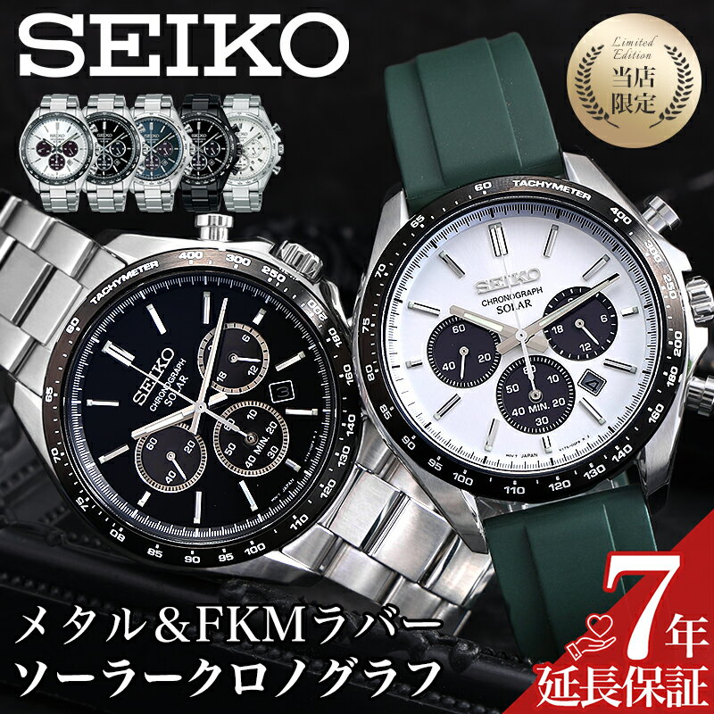 メーカー希望小売価格はメーカーサイトに基づいて掲載していますこの商品のお問い合わせ番号CPR-item-66369■ 商品詳細説明 セイコー[SEIKO]セイコーは日本初の腕時計・世界初のクォーツウォッチを製品化し、現在も時計関連で有名で、オリンピックなどの世界大会などで公式スポンサー、オフィシャルタイマーとしてたびたび参加しています。戦前・戦後から後楽園球場、東京ドーム、明治神宮野球場と球場のスポンサーになったのを日切りに、スポーツ競技場のタイマーでもおなじみです。入学祝いなどのプレゼント・ギフトとしてもとても人気のあるブランドです。スーパークリアコーティングを施した、質感の高い王道デザインのソーラークロノグラフが登場しました。ケース径は42mmで堂々としたデザインにしつつも、スッキリとした印象に。耐磁対応の新型にすることで、使い勝手も向上してます。またインデックス、時分針には、ルミブライトを使用し、夜間の視認性を向上させました。[MOD FKM RUBBER STRAP OFFSHORE / エフケーエム ラバーストラップ オフショア]”腕元のアップデート”をテーマにスタートした腕時計のカスタムパーツブランドMOD(エムオーディー)。MODはMake Only Detectの頭文字とModifyの二つを意味しています。MODはエッジの効いた独自の感性で今までの市場にはなかった新たなプロダクトを創造していき、腕時計の楽しみ方を再定義します。FKMラバーストラップ「Offshore/オフショア」ラバーストラップは、上質な質感とスポーティーな印象を両立させ、お手持ちの腕時計の魅力をさらに高めます。高機能なFKMラバー(フッ素ゴム)素材を使用しており、防水・耐油・耐熱・耐炎性を備え、日常使いからアクティブなシーンまで安心してお使いいただけます。豊富なカラーラインナップがあり、スポーツタイプからラグジュアリータイプまでどんな時計にもフィットします。[ 商品ポイント ]当店限定ベルトセット純正メタルベルトとウォッチカスタムパーツブランドMODのFKMラバーベルトオフショアを楽しめる当店限定セットです。高コスパ実用ウォッチの代名詞時には御子息へのプレゼントとして、時にはビジネスマンを支える普段使い用の一本として、確かな品質と手堅い実用性をお約束します。FKMラバーベルト“オフショア”自然な湾曲により腕にフィットしやすい設計で、圧倒的な強度を誇る「FKMラバー」を使用した高品質ラバーベルトです。“これでいい”を超えたデザイン洗練されたデザインはもはや”これがいい”と言わしめるクオリティ。特にNo.1は王道のパンダクロノに文字盤がわずかにシルバーがかった透き通るようなホワイトで、より一層洗練された風合いがオススメ。日常で真価を発揮普段使いで重宝するソーラー充電とカレンダー機能を搭載。クロノグラフなども併せ持ち、ビジネスシーンで根強い人気を誇ります。もちろんカジュアルとも相性◎細部に宿るセイコースピリット安定して高品質プロダクトを供給し続けるセイコーらしい堅牢なディテール。人気の秘訣は細部まで行き届いたクオリティの追求にあります。十分な存在感ステンレス素材のケースやベルトは重厚感があり、一定の重みを感じたいという方には満足度の高い着用感です。抜群の耐傷性ダイヤモンドの次に固いモース硬度9のサファイアクリスタルガラスを風防に採用。高級時計に使用される素材をスタンダード化するのがセイコープライド。6色から選べるカラーバリエーションFKMラバーベルトは定番のブラック、ネイビー、シルバーから、個性を放つレッド、オレンジ、グリーンまで。豊富な選択肢からお選びいただけます。型番SBPY165SBPY167SBPY163SBPY169SBPY179シリーズSEIKO SELECTION(セイコー セレクション)ケース材質ステンレススティールケース径42.2mm×48.3mm(横×縦)ケース厚さ12.2mmベルト材質ステンレススティール / FKMラバー(フッ素ゴム)カン幅20mm腕回り純正メタルベルト装着時:最大約19.5cmMOD製ラバーベルト装着時:約13〜19.5cm※Dバックル装着時約1.5cm長くなります。重さ純正メタルベルト装着時:約134gMOD製ラバーベルト装着時:約90g※Dバックル装着時約12g重たくなります。ケースカラーシルバー ブラックベルトカラーシルバー ブラック ブラック グリーン グレー ブルー オレンジ レッド機能精度:平均月差±15秒スクリューバックタキメーターつき過充電防止機能24時針つきストップウオッチ機能(1/5秒計測 60分計)カレンダー(日付)機能つきルミブライト:あり(針・インデックス)中留め:ワンプッシュ三つ折れ方式耐磁:ありムーブメントソーラー(電池式)フル充電時最大約6ヶ月間駆動風防素材サファイアガラス(スーパークリアコーティング)防水性日常生活用強化防水(10気圧)付属品ブランド純正BOX保証書※SDGs(環境問題)への取り組みの一環として、紙の説明書が付属しないブランドがございます。予めご了承くださいませ。