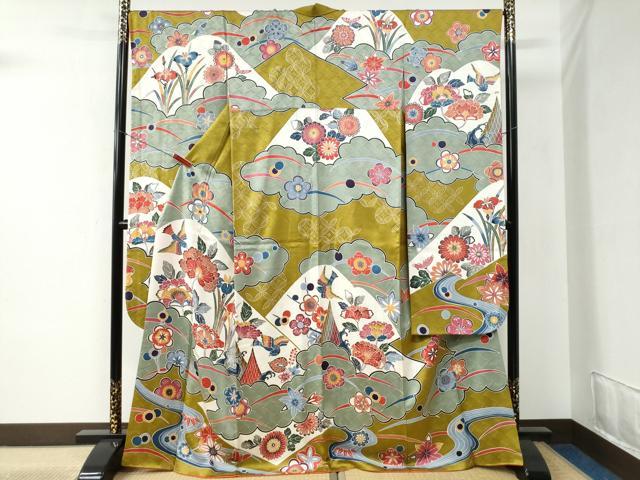 平和屋着物●豪華振袖 型染め 雲取り竜田川花鳥文 金彩 正絹 逸品 CABB4271yc