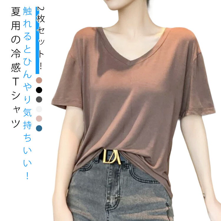 2枚セット 高品質 涼感 無地 薄手 春夏 ひんやり 涼しい vネック Uネック Tシャツ 接触冷感 半袖 暑さ対策 シンプル 無地 UV対策 抗菌防臭 吸水速乾 カジュアル インナー 大きいサイズ UVカット ゴルフウェア レディース 汗じみ防止 送料無料
