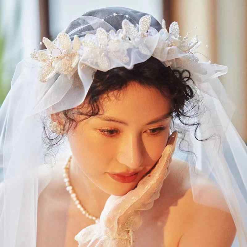 花嫁 結婚式 ビーズ リーフ ヘッドバンド ウェディングドレス アクセサリー 髪飾り ブライダル 結婚式 韓国 ティアラ チュール ふんわり ベール カチューシャ