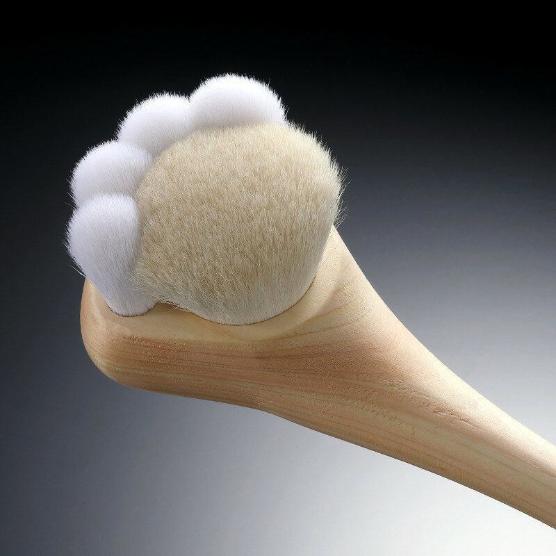 【FG-09】ネコ型ボディブラシ ネコの肉球の形をモチーフにしたボディブラシです。 もこもこの形状が愛らしく、 肌をチクチクさせずに濃密な泡立ちを生み出すのが特徴です。 熊野筆の技術を用いて作られたブラシは、 化粧筆のように毛先がふわふわで、やさしい肌あたり。 毛先のある毛だけを丁寧に集めた「命毛(いのちげ)」を使用しており、 毛穴の汚れを優しく洗い流します。 持ち手は府中家具メーカーによる国産ヒノキ。 流線形のフォルムで握りやすく、 背中までしっかり洗えるロングタイプです。 化粧箱には広島・平和記念公園の折り鶴再生紙を使用。 温かみのある風合いと高級感があり、 ギフトにも最適です。 【毛質】山羊毛+リサイクルポリエステル毛、ヒノキ 【毛丈】33mm 【本体サイズ】350×80×78mm 【パッケージ】90×375×85mm 【化粧箱】折り鶴再生紙(330mm×80mm×80mm) 【使用方法】 穂先をお湯で濡らし、石鹸(固形・液体どちらも可)をなじませます。 そのままクルクルと円を描くように、 マッサージするようにやさしく洗います。 【使用後のお手入れ】 使用後は流水で根本部分までしっかりすすいでください。 タオルでやさしく水気をしぼり、湿気の多い場所を避けて乾燥させます。 【使用上の注意】 天然系石鹸をご使用いただくと、毛先がより長持ちします。 (通常の使用で約1年程度が目安)