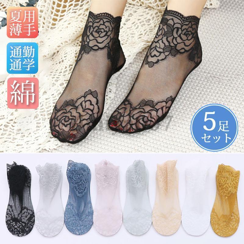 靴下 レディース クルーソックス 5足セット 無地 夏用 レース 花柄 春 薄手 通気性 刺繍 肌触り 快適 大人 脱げにくい ひんやり