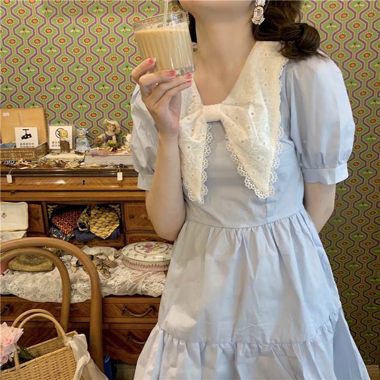 【P2倍&クーポン有】パフスリーブ レース フリル リボン ワンピース レディース プルオーバー ティアード フレアワンピース 個性的 春 夏 ミニ ひざ上 お尻カバー 半袖 二の腕カバー Vネック 大きな襟 ビッグカラー セミフレア Aライン ハイウエスト 落ち感