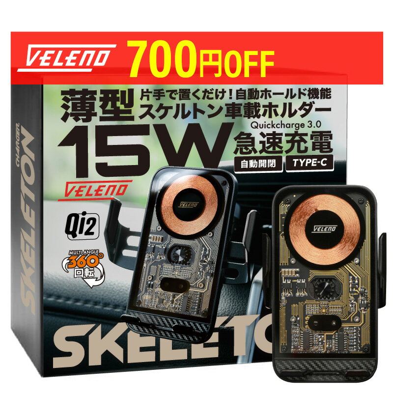 【クーポン利用で3280円】スケルトン スマホホルダー 薄型 車 車載 Qi 2 対応 ワイヤレス充電 VELENO 15W 自動開閉 吸盤式 エアコン取付 急速充電 充電 スマホ USB TypeC MagSafe マグセーフ iPhone Android Pixel Galax Huawei ケース対応