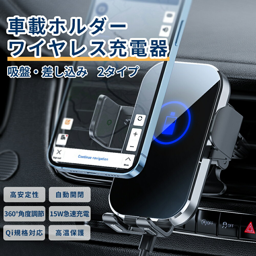 スマホホルダー ワイヤレス充電 差し込みタイプ 吸盤タイプ 携帯ホルダー カー用品 スマホスタンド 車載 車 充電器 車用品 自動開閉 最大15W出力 スマートセンサー 車載用 充電 急速 TypeC USB ケーブル スマホ iPhone Android 携帯充電器 Qi 対応 カーチャージャー充電器