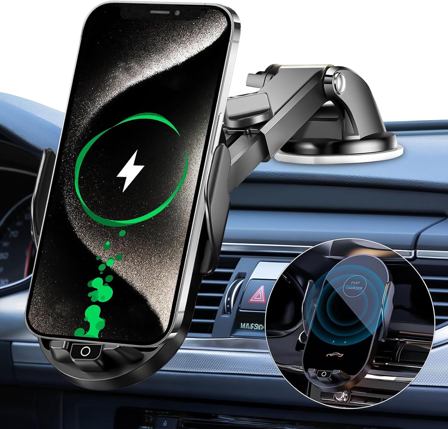 カラーブラック シルバー説明【エンジン止めても自動開閉できる 高さ調節】:従来の自動開閉車載ホルダーより、内部に大容量コンデンサを設置してエンジンが止めたあとも1回開閉でき、もっと便利になっております。それとも夏に車内温度上昇の影響も深く考えてバッテリー内蔵ホルダーより安全性アップしております。また、ホルダーの底部にも2段階高さ調節のしかけを取り付けて各種サイズのスマホともしっかり固定できます。 【15W/10W/7.5W/5W 急速充電サポート 多重充電保護】:新型の15W急速充電機能あるスマホに対応ため、通常の10W/7.5W/5W車載携帯ホルダーのうえに、この15W快速充電をサポートするqi車載スマホホルダーが設計されております。また、スマホを保護するためより上質なスマートチップ内蔵され、多重過充電保護システムを搭載、安定的に急速充電ことを確保します。 【厳選極上セット 36W快速充電シガーソケットと5A充電ケーブル付き 高コスパ】:付属するアルミニウム金属製シガーソケットはQC3.0快速充電サポートうえに、2ポートとも18W急速充電対応します。しかも、15W急速充電効果を十分きくため、高耐久性あるナイロン製5A急速充電ケーブルも付属されます。極上な性能が、手頃な価格セットであり、早速使ってみていただきませんか。 【粘着吸盤とエアコン吹き出しクリップ2種固定方法 落下防止】:吸盤と吹き出しクリップを付属して、ご好きによりエアコンやダッシュボード、フロントウィンドに固定できます。クリップの内部も滑り止め用マットが付き悪い道路状況にも安定に挟められます。そして粘着吸盤付いてゴムも水洗いして後繰り返し使えます。 【高耐久性 安定性 操作簡単 1年間品質保証】:qi 車載ホルダーは近づくと自動に開閉、ワンタッチで速やかに開けてスマホを取り出しられます、超簡単です。または表面に上質な樹脂が付けされて高光沢で高級感を添えながら高耐久性もあります。なお、ご購入日から弊店は1年安全保証をサポートします。