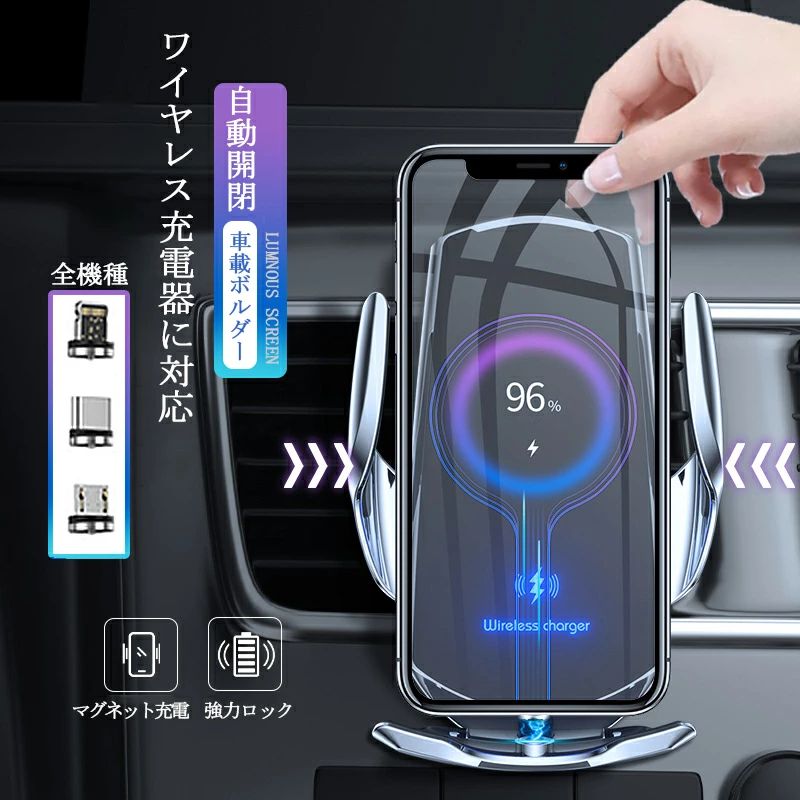 商品情報商品名車載ホルダー ワイヤレス充電器 スマホホルダー 最新式 iPhone Androidサイズ約129×64mmカラーブラック・シルバー・ブルー・レッド・ゴールド商品説明・置くだけでスマホをロック(スマート赤外線センサーがスマホを自動認識し自動開閉)、がっちり固定、ワイヤレス充電・背面のセンサーを軽く触れるだけで自動的にロックが解除され、取り外し可能・エアコン送風口にレバーを押して挟むだけの取付簡単な車載ホルダーです。認証基準:Qi 国際ワイヤレス充電規格に適応iPhone8, iPhoneX, iPhone8Plus, iPhone10~14シリーズ、 Galaxy S6,S7,S8シリーズ、Huwawei P30シリーズ,Mate20Pro,Mate30シリーズ,Mate40シリーズなどの QC ワイヤレス充電器対応。30日間返品保証(取付が適合せず、ご購入時と同様の状態で返品が可能でしたら返品を承りますのでお問合せからお申し付けください。*送料はお客様ご負担となります。)【SS4H限定♪クーポン利用で2384円】 車載ホルダー ワイヤレス充電器 スマホホルダー 自動開閉 車 エアコン吹き出し口 車載用ホルダー スマホスタンド ワイヤレス ワイヤレス充電 Qi 車載用 オートセンサー オートホールド スマホ置き iPhone Android 送料無料 着脱簡単! オートセンサー(自動開閉)・ワイヤレス充電 iPhone Android対応、車内のワイヤレス充電器、スタイリッシュな車載ホルダー。運転中も安定しています。・置くだけでスマホをロック(スマート赤外線センサーがスマホを自動認識し自動開閉)するスマホホルダー、がっちり固定、ワイヤレス充電・背面のセンサーを軽く触れるだけで自動的にロックが解除され、取り外し可能なオートセンサー機能・エアコン送風口にレバーを押して挟むだけの取付簡単な車載ホルダーです。*丸型のエアコン送風口には取付できない場合がございますので、取り付け可能な送風口を商品画像にてご確認ください。認証基準:Qi 国際ワイヤレス充電規格に適応iPhone8, iPhoneX, iPhone8Plus, iPhone10~15シリーズ、 Galaxy S6,S7,S8シリーズ、Huwawei P30シリーズ,Mate20Pro,Mate30シリーズ,Mate40シリーズなどの QC ワイヤレス充電器対応。【梱包内容】本体 約129×64mmUSBコード(約96cm)マグネットコネクタ(iPhone用、Android用、Ctype )ワイヤレス充電に対応していない場合に装着カーエアコン送風用コネクタ(別途、USBカーチャージャーが必要)*厚手のスマホカバーを使用している場合オートセンサーや充電機能が正常に作動しない場合がございますので予めご了承ください。*充電コードは必ず付属のUSB充電コードをご使用ください。商品に取扱説明書を同梱しておりませんので取扱説明書はこちらからダウンロードしてください。[関連ワード]スマホ用 スマホ 車載ホルダー ワイヤレス充電器 スマホ 車載ホルダー 充電器 車載ホルダー ワイヤレス充電 充電 エアコン吹き出し口 スマートフォン 車載ホルダー 置くだけ iphone 車載ホルダー 充電 クリップ式 xperia 車 強力固定 ベンツ エアコン吹き出し fit ダイハツ ムーヴ シエンタ 自動開閉 プリウス スマホホルダー 電動 レクサス トヨタ スバル ホンダ 日産 ミニ フォルクスワーゲン スズキ ダイハツ マツダ 三菱 ギフト プレゼント 誕生日 父の日 母の日 敬老の日 クリスマス クリスマスプレゼント バレンタイン ブラック シルバー ブルー レッド 黒 銀 青 赤 4時間 6