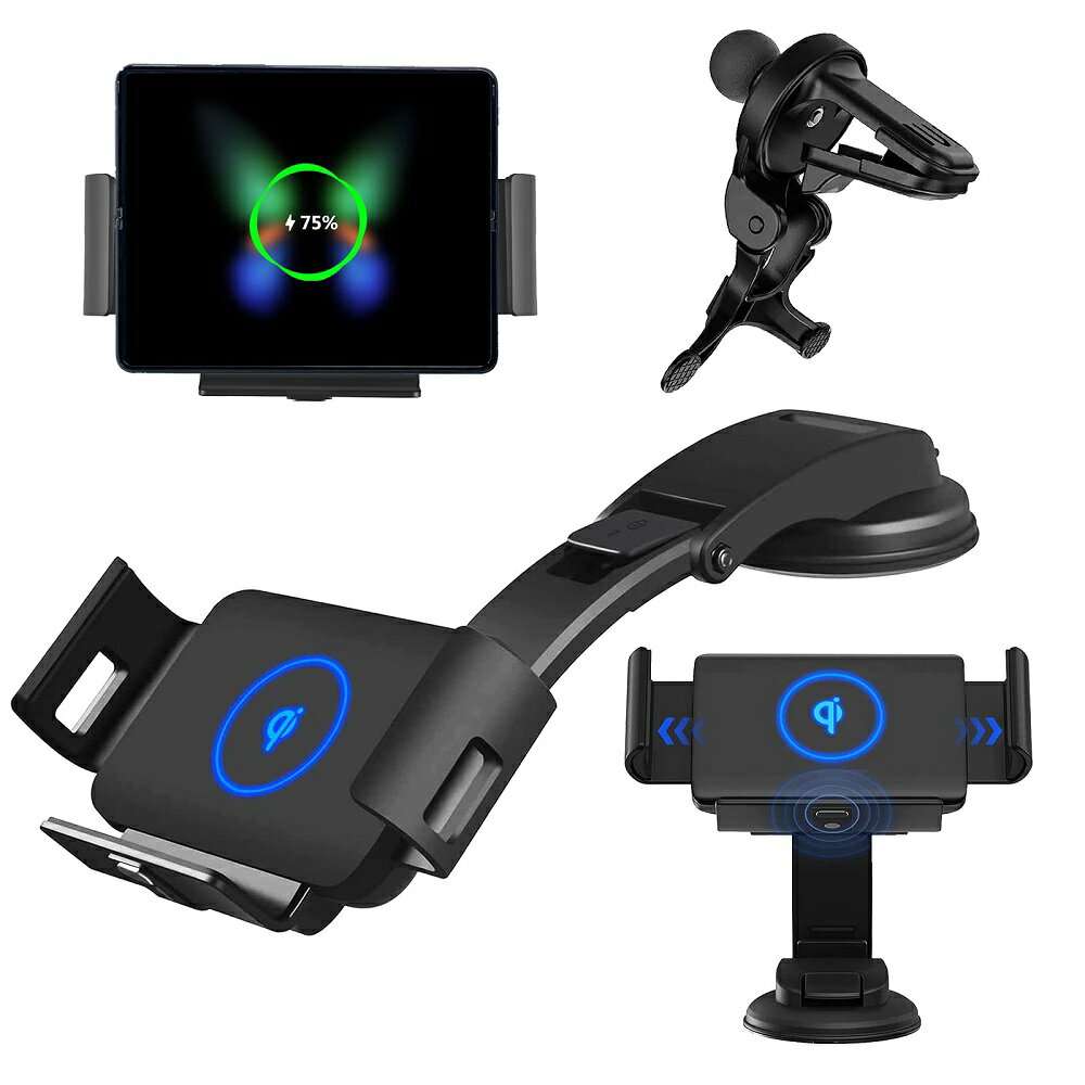 車載スマホホルダー 15Wワイヤレス充電器 自動開閉 吸盤式&クリップ式 2in1 片手操作 4.3-6.9インチ適用 スマホ/タブレットタンド 車載ホルダー Samsung Galaxy Z Fold4/Fold5/Fold3/ S23/S23