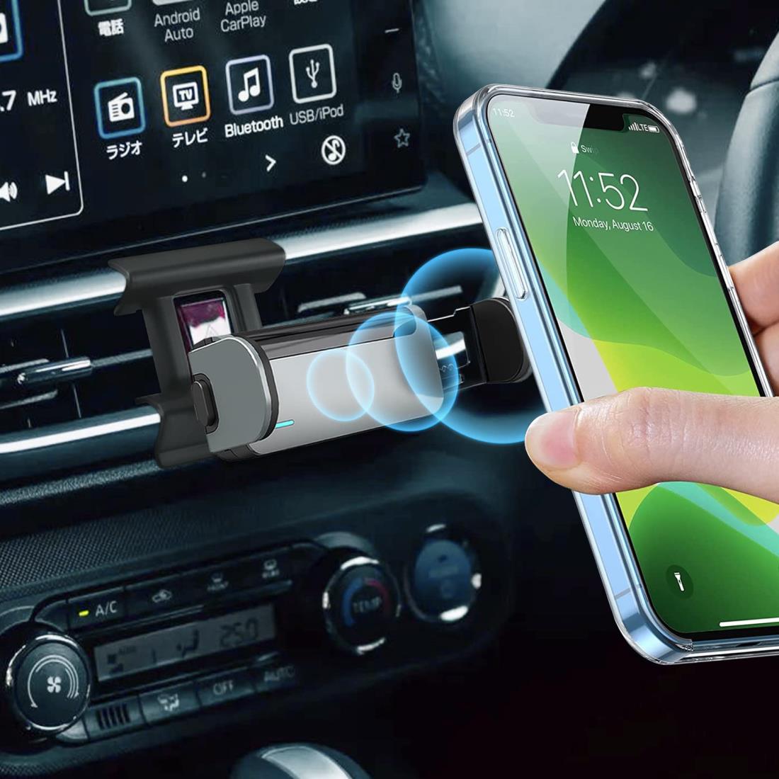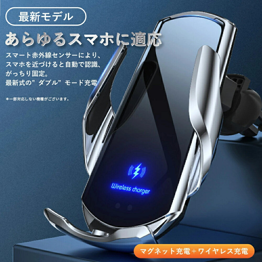 iPhone Android対応、車内のワイヤレス充電器、スタイリッシュな車載ホルダー。運転中も安定しています。・置くだけでスマホをロック(スマート赤外線センサーがスマホを自動認識し自動開閉)するスマホホルダー、がっちり固定、ワイヤレス充電・背面のセンサーを軽く触れるだけで自動的にロックが解除され、取り外し可能なオートセンサー機能・エアコン送風口にレバーを押して挟むだけの取付簡単な車載ホルダーです。*丸型のエアコン送風口には取付できない場合がございますので、取り付け可能な送風口を商品画像にてご確認ください。iPhone8, iPhoneX, iPhone8Plus, iPhone10~15シリーズ、 Galaxy S6,S7,S8シリーズ、Huwawei P30シリーズ,Mate20Pro,Mate30シリーズ,Mate40シリーズなどの QC ワイヤレス充電器対応。【梱包内容】本体 約129×64mmUSBコード(約96cm)マグネットコネクタ(iPhone用、Android用、Ctype )ワイヤレス充電に対応していない場合に装着カーエアコン送風用コネクタ(別途、USBカーチャージャーが必要)*革などの厚手のスマホカバーを使用している場合オートセンサーや充電機能が正常に作動しない場合がございますので予めご了承ください。*充電コードは必ず付属のUSB充電コードをご使用ください。 サイズ 充電コード付 サイズについての説明 出力:15W対応機種:Huwei P40Pro・Mate30・Mate20・MateRS、iPhone 14・14Pro・14Pro MAX、iPhone13シリーズ、iPhone12シリーズ、iPhone11シリーズ、iPhoneX・XSMax・XR、iPhone8・8X、Samusung Galaxy Note20・Note10+5G・Note10・Note9・Note8・S20・S10+・S10・S9+・S8+など※商品のサイズは手作業で測定させて頂いておりますので、若干の誤差があります。 素材 ABS、金属、その他 色 ブラック シルバー レッド ブルー 備考 ●製造ロットにより、細部形状の違いや、同色でも色味に多少の誤差が生じます。 ●パッケージは改良のため予告なく仕様を変更する場合があります。 ●出荷前に全て検品を行っておりますが、万が一商品に不具合があった場合は、お問い合わせフォームまたはメールよりご連絡頂けます様お願い申し上げます。速やかに対応致しますのでご安心ください。 ▼商品の色は、撮影時の光や、お客様のモニターの色具合などにより、実際の商品と異なる場合がございます。あらかじめ、ご了承ください。 ▼同じ商品でも生産時期により形やサイズ、カラーに多少の誤差が生じる場合もございます。 ▼他店舗でも在庫を共有して販売をしている為、受注後欠品となる場合もございます。予め、ご了承お願い申し上げます。 ▼サイズ詳細等の測り方はスタッフ間で統一、徹底はしておりますが、実寸は商品によって若干の誤差(1cm~3cm )がある場合がございますので、予めご了承ください。