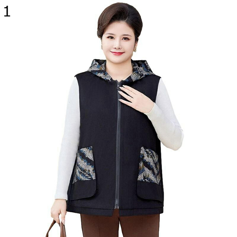 カジュアルベスト 婦人服 レディースベスト パッチワーク 帽子付き オーバーサイズ 春秋冬着 チョッキ 袖なしジャケット シニア女性 中年及び高齢者 40-80代 ストリート 自宅 休日 お年寄り