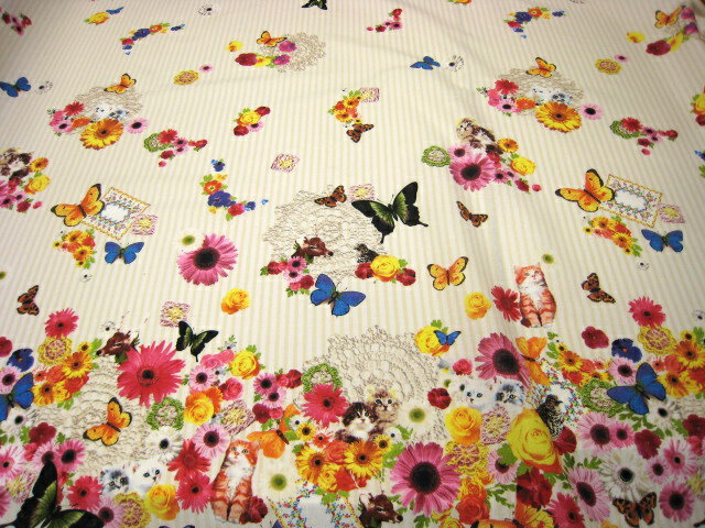 商品説明追記ー 数量1で長さ50cmの販売です。1M購入の場合は数量2を入力してください。 巾は変えられませんので、ご了承願います。 商品情報ー 素材 綿100% 巾108cm 長さ50cm~(数量1~) 厚さ 薄手(シーチング) メール便対応メータ数 3.5mまで ※天然繊維の生地使用のため、小さい点のような色抜けがございます。 一部混糸がある場合がございます。加工上避けられないため、多少のキズなどはご容赦ください。とっても可愛くて奇麗な CANDY PARTY ボーダー柄。大人気のため待望の再販が決定しました。かわいいネコやインコ、色鮮やかな花柄や蝶々、ドイリーモチーフまで用意された絵画のようなファブリックです。バックの背景はベージュのボーダ柄で間隔は約4mm。CANDYPARTYを象徴する素敵な生地で、インテリアや洋服、小物など。どれも素敵に仕上がると思います。再販版は花の色等が少し異なります。