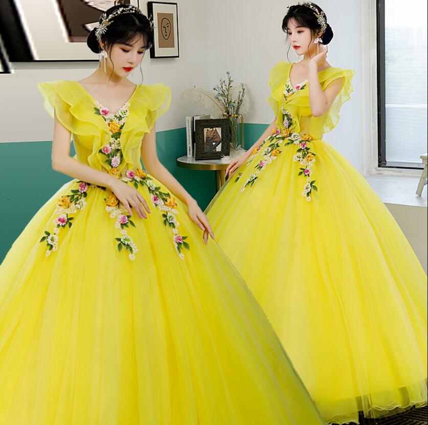 人気 カラードレス Vネック 送料無料 忘年会 結婚式 フォーマル パーティー 成人式 着痩せ プリンセス イブニングドレス 二次会 ウエディングドレス マキシ丈ドレス卒業式 入学式 編み上げ 30代 ママ 超可愛い Party Dress 袖なし 花柄 イエロー S M L XL 2XL 3XL