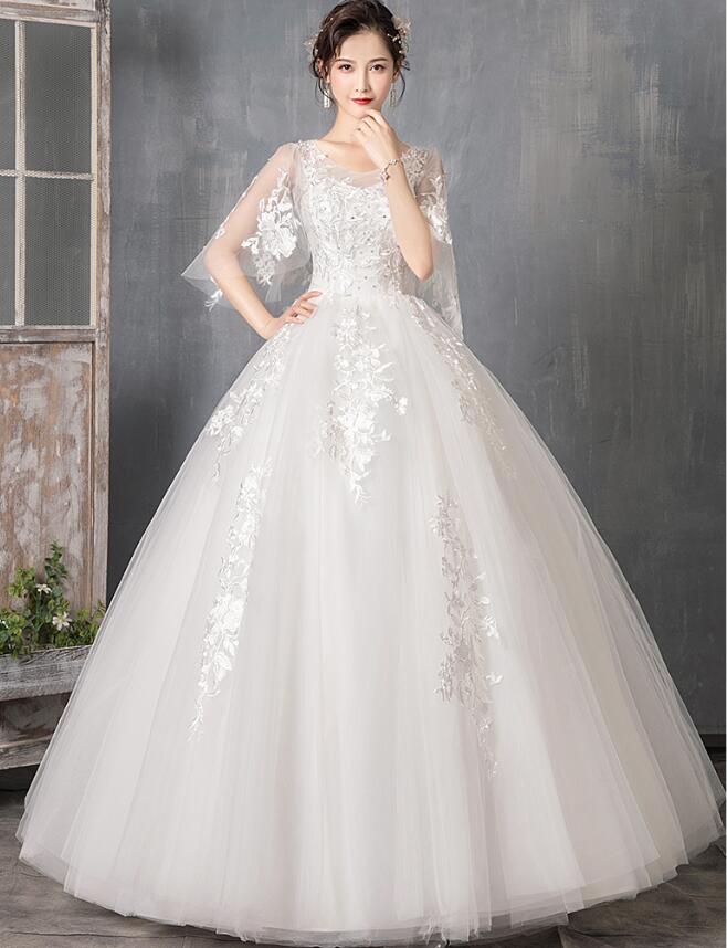 上品 パーティードレス イブニングドレス ウェディングドレス/ブライズメイド コーラス衣装 袖ありParty Dress 花柄 プリンセスラインS/M/L/XL/2XL/3XL花嫁ドレス ベルスリーブ 結婚式 ロングドレス プリンセスライン 披露宴 ブライダル 白 編み上げ