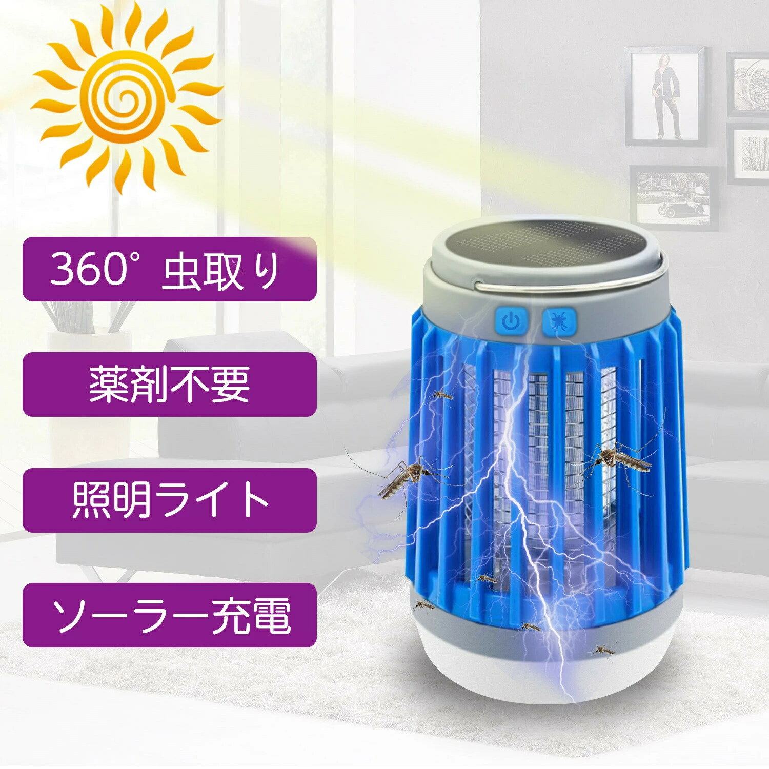 ランタン LED 電撃殺虫器 蚊取り器 ランタン 殺虫器 ブルー 懐中電灯 UV 紫外線 ライト 殺虫機 ソーラー 充電 吊り下げ キャンプ アウトドア 防災 災害 送料無料 SOLASATYU-BL