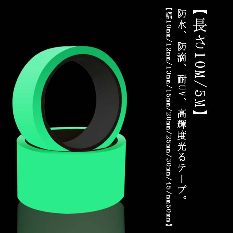 防水、防滴、耐UV、高輝度光るテープ。【幅10mm/12mm/13mm/15mm/20mm/25mm/30mm/45/mm50mm】【長さ10M/5M】【蛍光テープの材質】:PET、非毒性、環境に優しい、良好な蛍光効果、高輝度、長い持続時間、老化ではありません。【多場合に適用の蛍光テープ】:太陽や照明の光を吸収、暗くなったら発光する! 太陽光や蛍光灯の当り方(強さ・時間等)によって明るさや発光時間が変化します。【非常時の蓄光 反射 テープ】:停電時真っ暗な時も安心して歩ける!! 緊急避難、安全標識、道路案内、カード、写真、パンフレットや雑誌の表紙に適し。暗闇で光により避難経路を示す防災対策品です。【高輝度蓄光テープ】:インテリアとして部屋を飾り、階段や電気のスイッチに貼れば夜のトイレや非常時にも便利!!。【蛍光テープ屋外&夜光テープ】:好きな言葉を自由にアレンジできます、通常品よりも約3倍の明るさで発光致します。 サイズ幅10mm(10M)*2個 幅12mm(10M)*2個 幅13mm(10M)*2個 幅15mm(10M)*1個 幅20mm(10M)*1個 幅25mm(10M)*1個 幅30mm(5M)*1個 幅45mm(5M)*1個 幅50mm(5M)*1個サイズについての説明幅10mm(長さ10M) 幅12mm(長さ10M) 幅13mm(長さ10M) 幅15mm(長さ10M) 幅20mm(長さ10M) 幅25mm(長さ10M) 幅30mm(長さ5M) 幅45mm(長さ5M) 幅50mm(長さ5M)素材 色グリーン 濃いグリーン ブルー ピンク イエロー オレンジ備考 ●サイズ詳細等の測り方はスタッフ間で統一、徹底はしておりますが、実寸は商品によって若干の誤差(1cm〜3cm )がある場合がございますので、予めご了承ください。●製造ロットにより、細部形状の違いや、同色でも色味に多少の誤差が生じます。●パッケージは改良のため予告なく仕様を変更する場合があります。▼商品の色は、撮影時の光や、お客様のモニターの色具合などにより、実際の商品と異なる場合がございます。あらかじめ、ご了承ください。▼生地の特性上、やや匂いが強く感じられるものもございます。数日のご使用や陰干しなどで気になる匂いはほとんど感じられなくなります。▼同じ商品でも生産時期により形やサイズ、カラーに多少の誤差が生じる場合もございます。▼他店舗でも在庫を共有して販売をしている為、受注後欠品となる場合もございます。予め、ご了承お願い申し上げます。▼出荷前に全て検品を行っておりますが、万が一商品に不具合があった場合は、お問い合わせフォームまたはメールよりご連絡頂けます様お願い申し上げます。速やかに対応致しますのでご安心ください。
