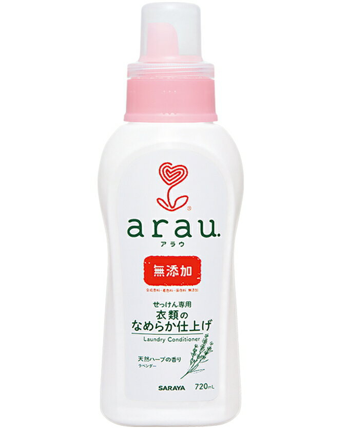 4973512308673商品サイズ (幅×奥行×高さ) :9.1×6.5×26.1cm原産国:日本内容量:720mL商品紹介●無添加と天然ハーブ配合の衣類のなめらか仕上げ剤です。●クエン酸のチカラでなめらかでやさしい仕上がりに。●衣類のふんわり感を保ちながら吸水性アップ。●黄ばみ・変色・ニオイの原因になるすすぎ残しを防ぎます。●天然ハーブ100%の香り:ラベンダー油。●合成香料、着色料、保存料無添加。●本品は、洗たく用せっけん専用のリンス剤です。「アラウ洗たく用せっけん」や「アラウ洗たく用せっけんゼラニウム」との併用をおすすめします。使用上の注意をよく読んでお使いください。【使用方法】・本品は洗たく用せっけんのすすぎ時に使用します。・柔軟剤投入口がある場合は規定量を投入口に投入します。※投入方法は洗たく機の取扱説明書を参照にしてください。・手洗いの場合は、時々かき混ぜながら3分浸し、最後に絞って干します。【使用量の目安】[全自動・二槽式(水量)]60mL (水量の目安 60L)50mL (水量の目安 50L)45mL (水量の目安 45L)30mL (水量の目安 30L)[ドラム式(洗たく物量)]30mL (洗たく物量6kg)20mL (洗たく物量3kg)[手洗い(水量)]10mL (水量の目安 10L)使用上の注意●塩素系漂白剤と絶対に混ぜないでください。有害な塩素ガスが発生し危険です。●せっけん、洗剤、漂白剤などと一緒に洗たく機に入れないでください。●原液が衣服に直接かかるとシミや変色する場合があります。かならずうすめて使用してください。●保管環境によっては白濁や香りの変化がありますが、性能上問題なくお使いいただけます。●製品の特性上、低温下で結晶を生じることがありますが、容器ごとお湯で温めていただくと元に戻ります。【使用上の注意】・用途(すすぎ時)以外に使わない。・子どもの手の届くところに置かない。・原液が直接肌に触れないようにする。・手洗いの時、手肌の弱い方や荒れ性の方は炊事用手袋を使用する。・使用後は、手を水でよく洗い、クリームなどでお手入れを。・高温や直射日光の当たる場所での保管は避ける。【応急処置】・飲み込んだ場合は水を飲ませるなどの処置をする。・目に入った場合は速やかに流水でよく洗眼する。・異常が残る時は商品を持参し専門医に相談する。原材料・成分クエン酸、水酸化カリウム、エタノール、天然精油