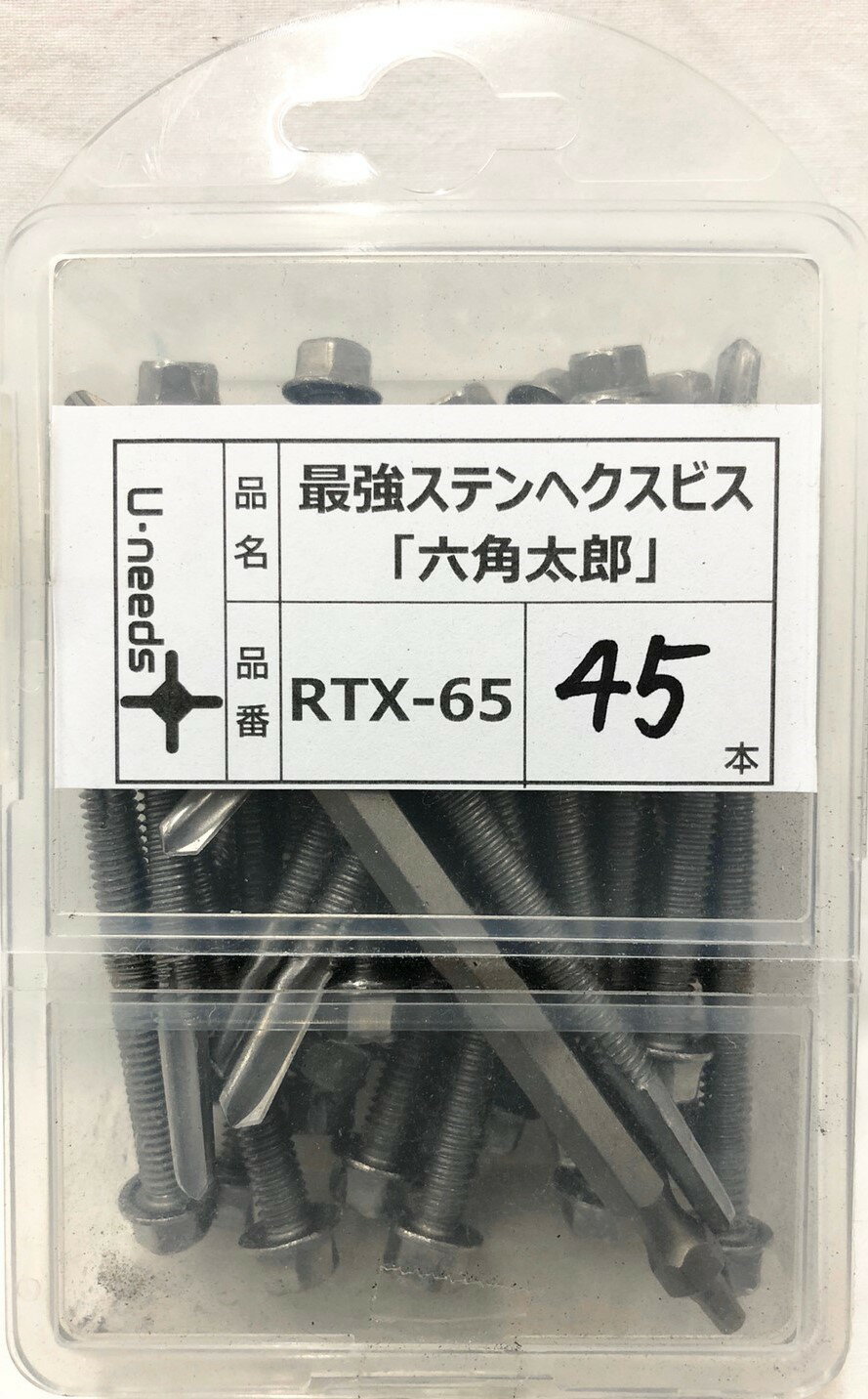 U・needs ユニーズ最強ステンヘクスビス 六角太郎 RTX-65 (45本入) 鉄板16mmSUS板6mmに下穴なし 六角頭で四角ビット対応 両頭ビットSQ2PH2x110が1本付属 5.5x65用途:ステンレス(430・304)6mm厚まで下穴なし鉄板(焼きなし)16mm厚まで下穴なし特徴:業界初のステンレス材6mm・鉄板16mmまで下穴なしでねじ込める最強ビス。作業効率アップ。8.0mmソケットまたは四角ビットでの締め込みが可能で、頭がなめにくく落ちにくい。六角太郎は5.5mm軸です。SUS410 ソケット8mm
