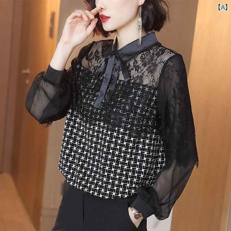 レディース シャツ 秋冬 トップス レース 長袖 ポロ襟 リボンタイ レース 格子チェック モノクローム エレガント 大人おしゃれ モダン カジュアル 上品 インナー 外出着 オフィス 食事会 記念日 鑑賞会 訪問着