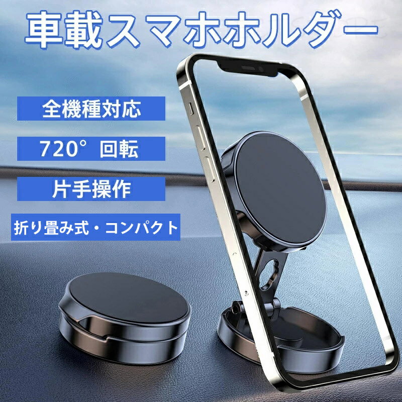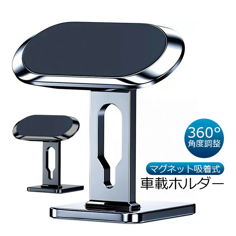 車載ホルダー スマホ スマートフォン用 360°回転 磁石 マグネット式 車 スマホホルダー 固定 粘着テープ式 スタンドアーム付 マグネット吸着 スマホスタンド 車内 車用 ダッシュボード用 コンパクト シルバー ブラック