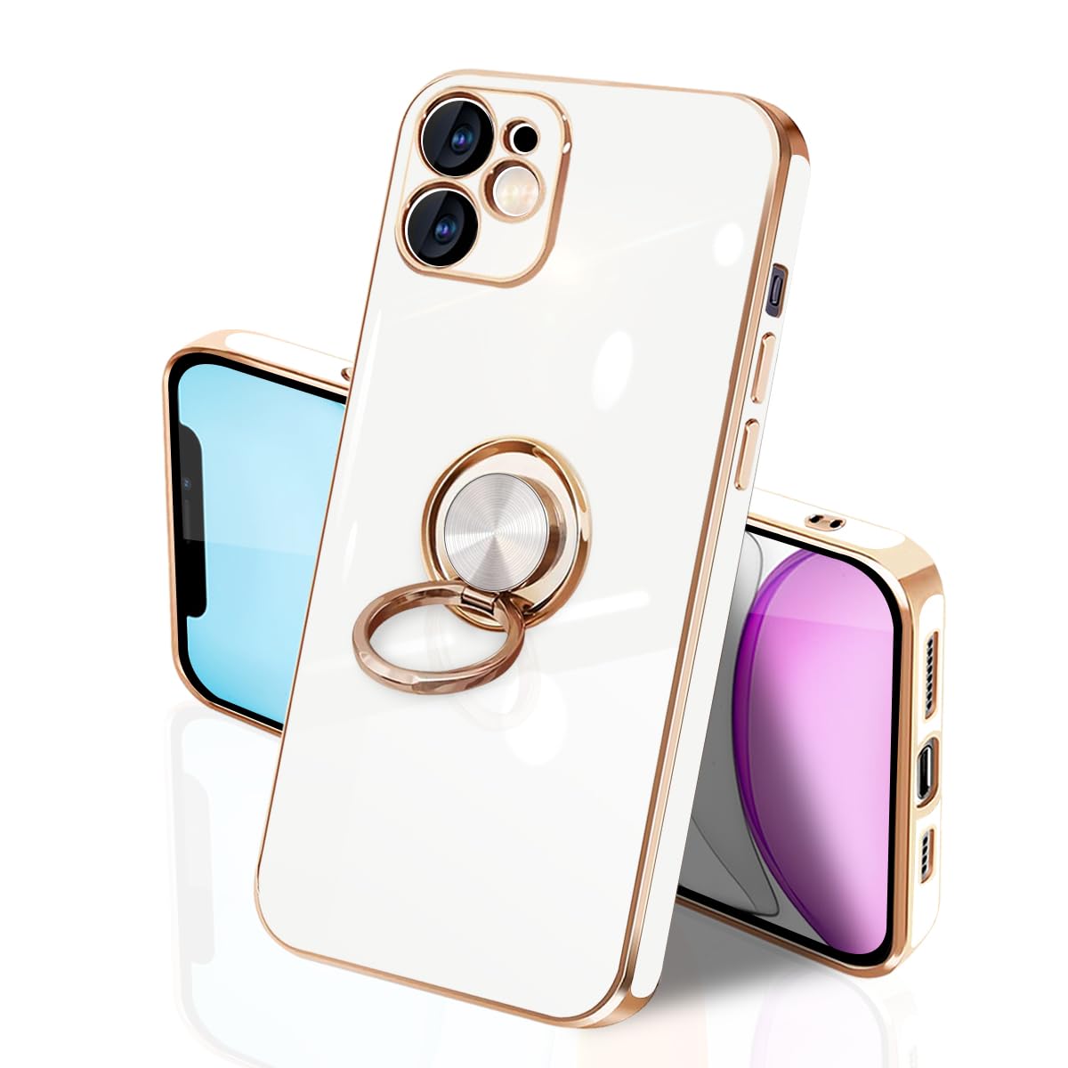 iPhone 11 ケース リング付き イフォン11 リング TPU カバー 全面保護 耐衝撃 スマホケース 360°回転 スタンド機能 携帯カバー 車載ホルダー対応 ストラップホール付き メッキ加工 擦り傷防止 6.1インチ(ホワイト)