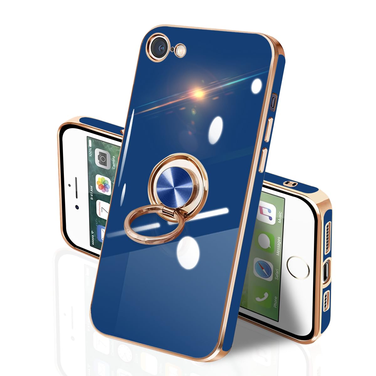 iPhone SE2 iPhone SE3 iPhone7 iPhone8 ケース リング付き イフォンSE3 リング TPU カバー 全面保護 耐衝撃 スマホケース 360°回転 スタンド機能 携帯カバー 車載ホルダー対応 ストラップホール付き メッキ加工 擦り傷防止 4.7インチ(ブルー)