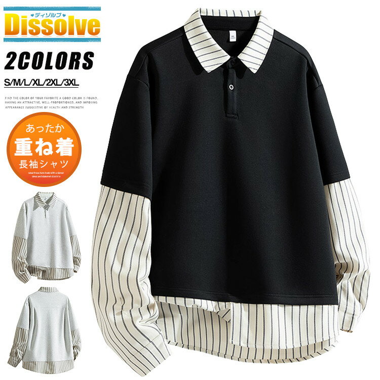 【送料無料】レイヤード シャツ メンズ 長袖 カジュアルシャツ 春 秋 切り替え プルオーバーシャツ ストライプ 無地 異素材 長袖シャツ 重ね着風 メンズシャツ 通勤 通学 20代 30代 40代 50代 ブラック 杢グレー