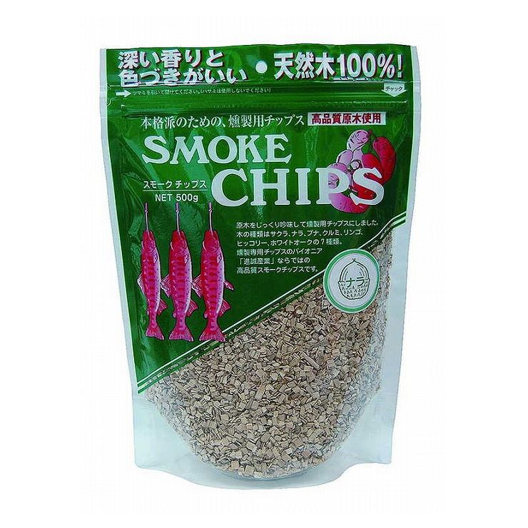 天然木100%、スモーク用チップ「サクラ材」■1袋500g■7種類のチップを用意(2021年4月時点) サクラ、ナラ、オニクルミ、リンゴ、ヒッコリー、ブナ、ホワイトオークがあります。【スモーク用チップ・ウッドの特長】○サクラ 日本では最もポピュラー。香りが強く、クセのある食品に合わせて使う。マトンやポーク向き。○ナラ 木材の中ではタンニンが多いため、色つきが早く、やや渋みがある。○オニクルミ ヒッコリーによく似た香りで、肉類、魚類にと幅広く利用することが出来ます。○リンゴ 甘い部類に属し、マイルドな仕上がり。クセのない淡白な食品(鶏肉や白身魚)に合う。○ヒッコリー 欧米では最もポピュラー。香りもよくオールマイティなチップ。魚類のほかに、ベーコン、ハムに使用される。○ブナ ナラと共に魚介類にマッチする。すっきりとした香りが特長。○ホワイトオーク ニッカウィスキーの樽を使用していますのでほのかに甘い香りがします。淡白な素材に向いています。多少の渋みはありますが、クセのない香りで魚類に合います。色づきも良好です。