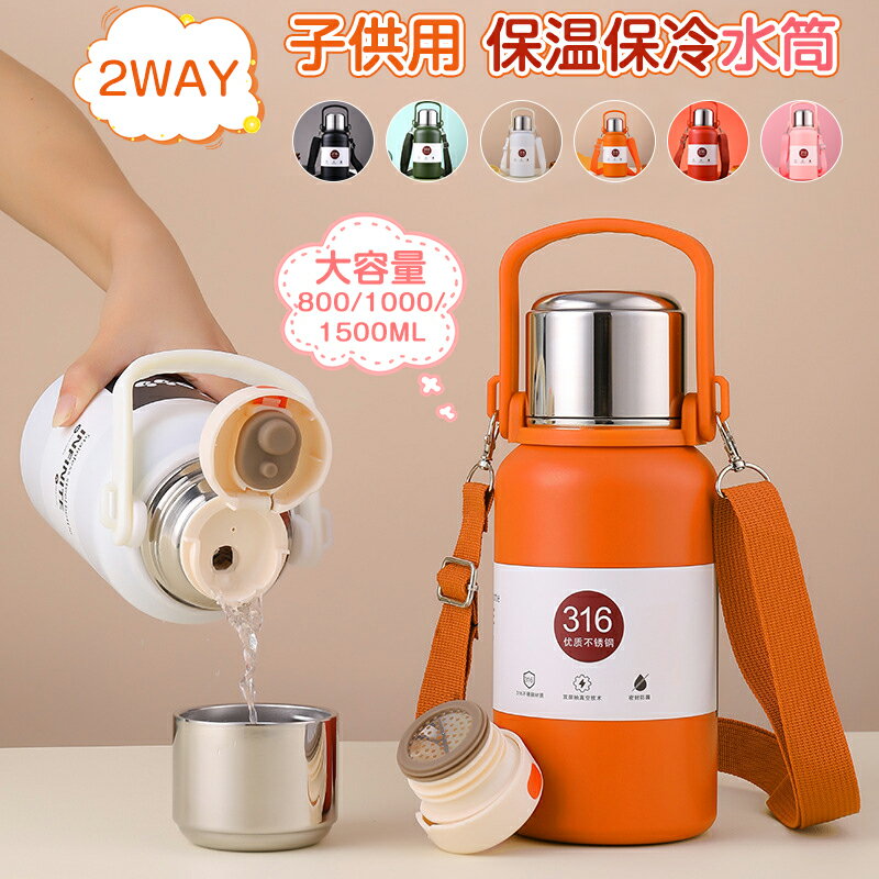 2WAY 水筒 保温 保冷 ステンレス 魔法瓶 真空断熱ケータイマグ 大容量 800/1000/1500ML 子供 スポーツボトル ストラップ付き 持ち運び便利 マグボトル フィルター付き 広口 ボトル お手入れ簡単 アウトドア キャンプ 部活 通学 通