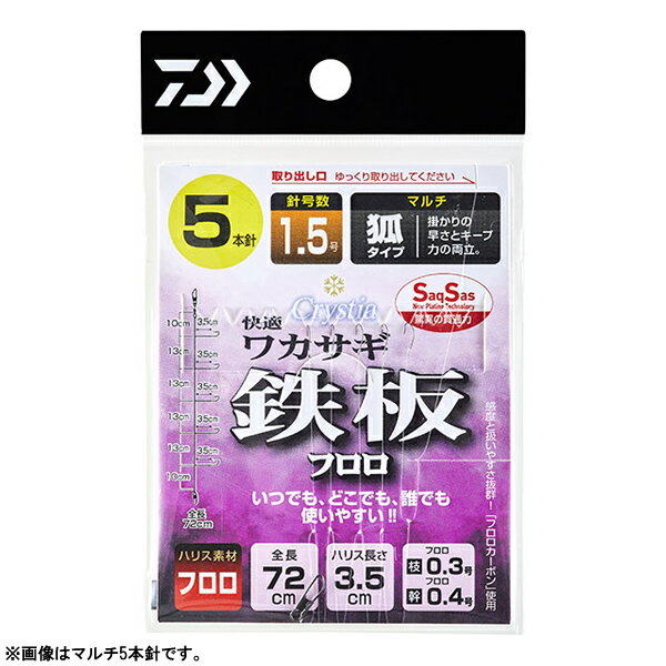 ●商品名に【同梱不可】【他商品同時注文不可】と記載されている商品は別倉庫から発送となるため同梱できません。システム上、同時注文が可能ですが、その際は勝手ながらキャンセルとさせて頂きます。キャンセルに伴い、各種キャンペーンの適用など取消となりますが、ご注文条件やポイントの補填・補償等は一切お受けできかねます。また、再度ご注文いただく際に完売となっている場合や、キャンペーン条件が異なる場合がございます。●掲載商品は複数サイトおよび実店舗で併売しています。ご注文タイミングにより欠品し、お取り寄せにお時間を頂く場合やお手配が出来ずにやむを得ずキャンセルさせて頂く場合がございます。●商品画像は代表画像です。仕様変更により商品スペックやパッケージなど変更となる場合がございます。仕様変更に伴う返品、商品交換の際の往復送料はお客様ご負担となります。●店舗都合・お客様都合に依らずご注文内容の修正やキャンセルを行った際に在庫なしとなる場合やポイント、クーポンなど各種キャンペーンが適用外となる場合がございます。大変恐縮ながらこのような場合でも補填などは出来かねますのでご了承下さい。ワカサギ仕掛けの鉄板登場。コシとハリがあり吸水性ががないフロロカーボン糸を使用した長持ち設計の「鉄板」シリーズ。・ハリスが3.5cmセミロングハリスなのでゆっくり誘いができ、食い渋り時でも有効・吸水性が無いフロロカーボン糸なので長くお使いいただいても糸のへたりが少ない仕掛け・幹糸は初心者でも扱いやすく、トラブルの少ない0.3号〜0.5号の太仕掛け・驚異の貫通力、サクサス搭載のマルチ(キツネ型)は、より掛かりが早いのが特徴【ダイワオリジナル!釣果に差がつくD-MAXワカサギ】マルチ(新キツネ型):掛かりの速さとバレにくさを両立【驚異の貫通力でチャンスを逃さない『SaqSas(サクサス)』】従来のメッキ処理では実現できなかった驚きの貫通力を持つ表面処理テクノロジー。ハリの表面にフッ素系特殊プレーティング加工を施すことで、刺さり性能は従来の塗装ハリに比べて最大40%(平均約20%)アップ(グローブライド社比)。今まで合わせきれなかった小さなアタリも逃さずキャッチ。今までのハリと一味も二味も違う「サクッと刺さる」感覚は、一度体感すると忘れがたいものとなるはずだ。なお、非常によく刺さるハリとなっているため、取り扱い時にはこれまで以上に注意して頂きたい。使用針:D-MAXワカサギ マルチ(新キツネ型)針号数:1.5号入数:5本針×1セット全長(針・仕掛):72cmハリス号数:0.3号幹糸号数:0.4号ハリス長さ:3.5cmタイプ:鉄板ハリ種類:サクサス釣り方、フィールド:川・池釣り(ルアー以外)代表対象魚:ワカサギ(公魚) TKM-05-06-04