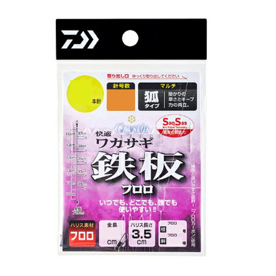 ●商品名に【同梱不可】【他商品同時注文不可】と記載されている商品は別倉庫から発送となるため同梱できません。システム上、同時注文が可能ですが、その際は勝手ながらキャンセルとさせて頂きます。キャンセルに伴い、各種キャンペーンの適用など取消となりますが、ご注文条件やポイントの補填・補償等は一切お受けできかねます。また、再度ご注文いただく際に完売となっている場合や、キャンペーン条件が異なる場合がございます。●掲載商品は複数サイトおよび実店舗で併売しています。ご注文タイミングにより欠品し、お取り寄せにお時間を頂く場合やお手配が出来ずにやむを得ずキャンセルさせて頂く場合がございます。●商品画像は代表画像です。仕様変更により商品スペックやパッケージなど変更となる場合がございます。仕様変更に伴う返品、商品交換の際の往復送料はお客様ご負担となります。●店舗都合・お客様都合に依らずご注文内容の修正やキャンセルを行った際に在庫なしとなる場合やポイント、クーポンなど各種キャンペーンが適用外となる場合がございます。大変恐縮ながらこのような場合でも補填などは出来かねますのでご了承下さい。ワカサギ仕掛けの鉄板登場。コシとハリがあり吸水性ががないフロロカーボン糸を使用した長持ち設計の「鉄板」シリーズ。・ハリスが3.5cmセミロングハリスなのでゆっくり誘いができ、食い渋り時でも有効・吸水性が無いフロロカーボン糸なので長くお使いいただいても糸のへたりが少ない仕掛け・幹糸は初心者でも扱いやすく、トラブルの少ない0.3号〜0.5号の太仕掛け・驚異の貫通力、サクサス搭載のマルチ(キツネ型)は、より掛かりが早いのが特徴【ダイワオリジナル!釣果に差がつくD-MAXワカサギ】マルチ(新キツネ型):掛かりの速さとバレにくさを両立【驚異の貫通力でチャンスを逃さない『SaqSas(サクサス)』】従来のメッキ処理では実現できなかった驚きの貫通力を持つ表面処理テクノロジー。ハリの表面にフッ素系特殊プレーティング加工を施すことで、刺さり性能は従来の塗装ハリに比べて最大40%(平均約20%)アップ(グローブライド社比)。今まで合わせきれなかった小さなアタリも逃さずキャッチ。今までのハリと一味も二味も違う「サクッと刺さる」感覚は、一度体感すると忘れがたいものとなるはずだ。なお、非常によく刺さるハリとなっているため、取り扱い時にはこれまで以上に注意して頂きたい。使用針:D-MAXワカサギ マルチ(新キツネ型)針号数:2.0号入数:5本針×1セット全長(針・仕掛):72cmハリス号数:0.3号幹糸号数:0.5号ハリス長さ:3.5cmタイプ:鉄板ハリ種類:サクサス釣り方、フィールド:川・池釣り(ルアー以外)代表対象魚:ワカサギ(公魚) TKM-05-06-04