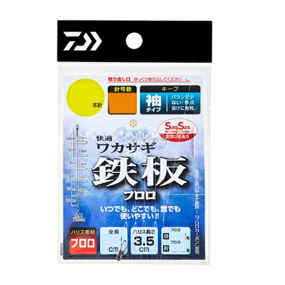 ダイワ 快適ワカサギSS鉄板フロロ K 6本 (ワカサギ仕掛け) 1号■アイテム:キープ袖型■タイプ:鉄板■ハリ種類:サクサス■ハリ数(本):6■ハリ号数:1.0■ハリス(号)フロロ:0.2■幹糸(号)フロロ:0.3■ハリス長(cm):3.5■全長(cm):90■発売年:2019年9月≪ダイワ ワカサギ仕掛け≫●ワカサギ仕掛けの鉄板登場●コシとハリがあり吸水性ががないフロロカーボン糸を使用した長持ち設計の鉄板シリーズ●ハリスが3.5cmセミロングハリスなのでゆっくり誘いができ、食い渋り時でも有効●吸水性が無いフロロカーボン糸なので長くお使いいただいても糸のへたりが少ない仕掛け●幹糸は初心者でも扱いやすく、トラブルの少ない0.3号~0.5号の太仕掛け●驚異の貫通力、サクサスフックのキープ(袖型)採用、バラシにくいのが特徴です●釣場や状況に合わせてお選びいただける5本、6本、7本をご用意「在庫有り」の表示であっても、必ずしも在庫を保証するものではありません。掲載商品につきましては、各モール及び実店舗と在庫を共有しております。完売や欠品の場合は、誠にご迷惑をお掛けいたしますが、御注文をキャンセルさせていただく場合がございます。予めご了承ください。なお、「ご注文内容の確認とお届けについてのお知らせ」メール送信後は、キャンセルを承ることが出来かねますのでご了承ください。この商品のサイズは5、重さは10です。こちらのサイズが合計で100以下、且つ重さが700以下であれば、ゆうパケットで発送できます。この商品のみのご注文の場合、ゆうパケットでの配送時には合計で20個まで入ります。オールフロロカーボン仕掛けで頑丈設計、ワカサギ仕掛の鉄板