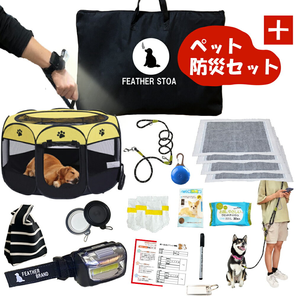 商品情報製品内容内容品1 折り畳みケージ&ケージバッグ(MサイズorLサイズ)2 リストライト電池type23 単4電池6本4 リード&ナイトチャーム5 使い捨て靴下20枚6 消臭袋7 ペットウェットティッシュ8 トイレシーツ4枚9 ミニ食器2個10 防災準備book裏表11 情報シート12 マジックペン13 迷子札14 ニットバッグ収納後サイズ 重量Mサイズ 約35cm×60cm 重さ1.9kg(内ケージ0.9kg)推奨犬種 小型犬〜中型犬、猫Lサイズ 約50cm×60cm 重さ2.3kg(内ケージ1.3kg)推奨犬種 中型犬〜大型犬この商品は ペット防災セット 防災バッグ 折り畳みケージ リストライト ショルダーリード 光るチャーム 迷子札 犬猫兼用 収納ケース付き 災害時ペットハウス 犬用 中型 大型 軽量コンパクト 送料無料 ポイント災害時にも役立つ、ペット用折り畳み折式ケージを含む防災セットです おしゃれで可愛いペット用サークル 災害時に必要なグッズが入った。ペット防災セットです。いざ揃えるとなると意外と大変な防災グッズ。そんな悩みを解決するセットをご用意しました。野外や体育館に避難した場合の折り畳みケージ。停電時や夜間の野外を想定したハンズフリーのリストライト。ハンズフリーで愛犬と飼い主をつなぐショルダーリード。トイレ用品や迷子札などどれも災害時には必要不可欠な物を集約。"起きないにこしたことはない災害や震災。しかし万が一に備え、準備しておくのが愛犬やペットを育てる、飼い主の役割です。大切なペットを守ってあげられるのはあなただけです早めの防災準備を進めておきましょう。収納後サイズ 重量Mサイズ 約35cm×60cm 重さ1.9kg(内ケージ0.9kg)推奨犬種 小型犬・猫ー中型犬Lサイズ 約50cm×60cm 重さ2.3kg(内ケージ1.3kg)推奨犬種 中型犬-大型犬フェザーストア ショップからのメッセージ 納期について 通常2営業日以内に発送いたします。4
