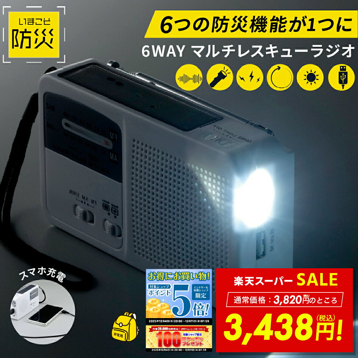 コンパクトなサイズなので持ち運びしやすい!災害時の強い味方!多機能ラジオ!【6つの防災機能が1つに!緊急時に役立つラジオ】ソーラー充電・手回し充電・携帯電話の充電・サイレン・LEDライト・AM/FMラジオの6種類の使用が出来ます。「非常時」「災害時」いつ何があるかわからないから…1つあればほっと安心の多機能ラジオです。●コンパクトなサイズで持ち運びしやすく、緊急時に簡単に使用できます。●充電が無くなっても単4乾電池3本(別売)で使用可能です。●充電方法:ソーラー充電/手回し充電/外部コンセント充電の3種類になります。※外部コンセント充電は、付属のUSBケーブルでの充電を行ってください。●ライトの明るさは、45000-55000MCD(ミリカンデラ)になります。●ワイドFM対応(ワイドFM:FM補完放送)・・・・商品詳細・・・・商品名6WAYマルチレスキューラジオ型番SV-5745 サイズ80×140×35mm重量232g材質本体/ABS、PS原産国中国保証期間お買い上げより半年間区分電化製品:家電・AV・カメラ関連商品【SS★セール35%OFF!! 12/4 20:00〜】多機能 防災ラ...【大容量10000mAh】防災ラジオ 多機能ラジオ モバイルバッテリー...セルレット 簡易便座 手提げ袋付き 送料無料 防災 災害 震災 地震 ...12,800円8,800円4,950円【SS★セール半額! 12/4 20:00〜】股関節 痛み 腰痛 サポ...ル・カエル用 交換用 エコパワーチップ 10S ルカエル エコクリーン...【SS★セール半額!! 12/4 20:00〜】せのびーる せのび〜る...3,289円3,300円3,289円ジュテーム はだいろ工房 ボディカバーファンデーション 35g スキン...セルレット 防災備蓄用マルチシート アルミパック圧縮 真空パック毛布 ...湯たんぽ 蓄熱式湯たんぽ 蓄電式湯たんぽ おしゃれ かわいい カイロ ...3,388円3,080円3,580円関連ワード: 防災ラジオ 多機能 手回し ソーラー 6WAY マルチレスキュー 懐中電灯 サイレン付 乾電池式 スマホ充電 AM FM ワイドFM LEDライト USB充電 地震 災害 手動発電 ソーラー充電 充電式 防災用品 緊急用 ラジオ 防災用 ラジオライト コンパクト 軽量 防災ラジオ 防災ラジオ 多機能 手回し ソーラー ラジオ 手回し 防災ラジオ ラジオ ラジオ ラジオ 手回し ラジオ コンパクト