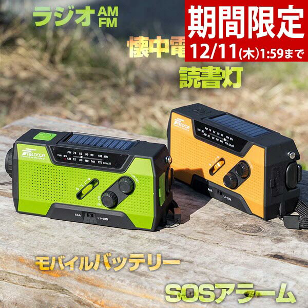 【期間限定3,630円〜12/11(木)01:59まで】FIELDOOR 防災ラジオ 多機能 AM/FM ラジオ 1台5役 防災グッズ 懐中電灯 生活防水 読書灯 モバイルバッテリー SOSアラーム 3WAY充電 USB充電 手回し充電 ソーラー充電 乾電池式 ●[送料無料]