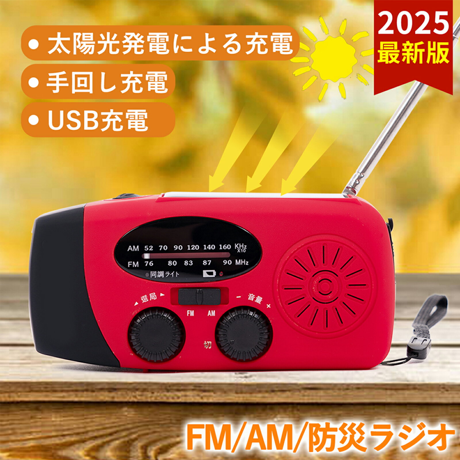メーカー希望小売価格はメーカーサイトに基づいて掲載しています FM/AM/防災ラジオ 信号受信:AM 520-1710Khz / FM 76-90Mhz。 防水性:IPX-3 台風、津波、地震、停電など災害を防ぐための緊急対策ラジオです。このラジオライトは、停電、電気通信の不安定または中断された場合に、外界からの災害情報を収集可能。緊急時、救援者は迅速に位置を特定する可能。 高輝度懐中電灯 高輝度3つのLEDライトを内蔵された充電式ライト、備えておくと安心なライトです。 外装全体は明るくの赤、光不足の場合も目に立ちます。 モバイルバッテリー 2000mahバッテリーを内蔵され、モバイルバッテリーとしても使用可能。緊急時に携帯電話などUSBグッズに携帯充電器などとして充電可能。 3つの充電方法 手回し充電手回しラジオ:製品の背面にあるハンドルを回すと充電可能。ソーラー充電ラジオライト:ソーラーパネルを日差しの方向に向けると、自動的に充電可能 USBケーブルで充電:付属しているUSBケーブルでUSBポートから充電可能 小型・超軽量 12.8cm * 6cm * 4.5cm 重量200g!緊急時に持ち運びやすく、収納しやすい。 完全防水ではないので、水に浸すことはいけません新規お友だち登録で 今すぐ使えるクーポン※上記のクーポンと併用不可 店舗内全商品対象 5%OFF ↓ ↓ ↓ ↓ ↓