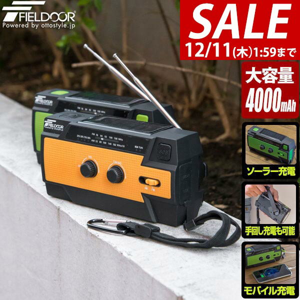 【4,290円→SALE3,630円〜12/11(木)01:59まで】【楽天1位】FIELDOOR 防災ラジオ スマホ充電 4000mAh 大容量バッテリー内蔵 多機能 手回し 1台6役 ラジオ ライト 生活防水 LEDライト モバイルバッテリー USB充電 ソーラー充電 防災グッズ ★[送料無料]