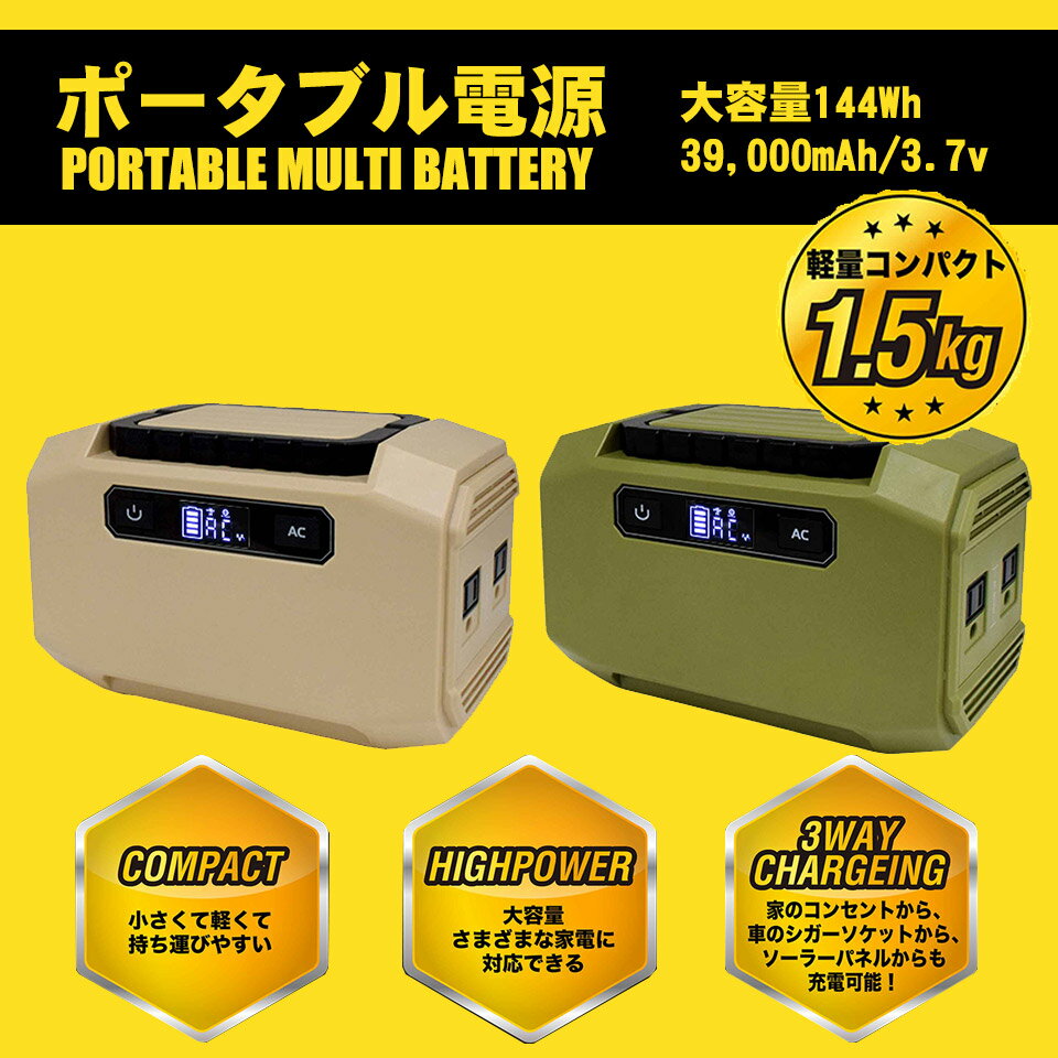 ギフト対応 商品概要 商品名 ポータブルマルチ電源 商品説明 アウトドアはもちろん、防災時などのいざという時の緊急電源としても大活躍! 1台持っておくと安心のポータブルマルチ電源です。 コンパクトサイズで持ち運びも、収納にも便利です。 ・複数の出力ポート搭載! AC/DC/USBの3種類の出力ポートでいろんなシチュエーションでお役立ち! ノートパソコンやスマートフォン、車載用ポータブルモニターや小型扇風機などの一部家電。 電源の無い場所で起動させたい時にあると便利です。 ・バッテリー残量を液晶表示 残量確認は大事!どれだけ残っているのか?どれだけ補充が進んだのか? 確認が出来るのは安心につながります。 【商品内容】 - ポータブル電源 本体 - DCシガー充電ケーブル - AC充電ケーブル - シガーライター メスソケット - 取扱説明書(日本語) 仕様 サイズ:W198×D108×H126mm 重量(約):1.5kg 内蔵バッテリー:リチウムイオンバッテリー 電池容量:39000mAh/3.7V 144Wh DC入力(充電仕様):DC 15V/2A 充電時間:DC 15V:7時間 USB出力:5V-3.1A(MAX) DC出力:9〜12.6V/10A、120W(Max) AC出力:150W本電源は修正波を出力します 110V(電圧は国や地域によって異なります) 電力残量表示:LED液晶画面 動作温度:-10℃〜40℃ バッテリー寿命:>500回(フル充電回数) 保証 保証期間 … 1年 ※ 商品の入荷時期により、色合いなどが変わってきます。複数購入された方や、前回購入された方で仕様や色合いが違う等のクレームは一切お受けできません。ご了承ください。 ※ 輸送時の擦れや細かなキズがある場合がございます。必ずご理解の上ご購入ください。 ※ 商品到着後7日以内の初期不良のみ、交換いたします。7日以降、また、加工された商品はどの様な理由であれ、交換対象外となりますのでご了承ください。 当店では、できる限りお得に商品をお届けできるよう努めておりますが、 一部地域につきましては、送料無料商品につきましても下記の通り送料を頂戴しております。 沖縄県:3,000円 北海道:1,000円 そのほか離島・一部地域は、別途追加送料が発生する場合がございます。 あらかじめご了承くださいますようお願い申し上げます。 注意点 ※ 輸送時の擦れや細かなキズがある場合がございます。必ずご理解の上ご購入ください。 ※ 商品到着後7日以内の初期不良のみ、交換いたします。7日以降、また、加工された商品はどの様な理由であれ、交換対象外となりますのでご了承ください。