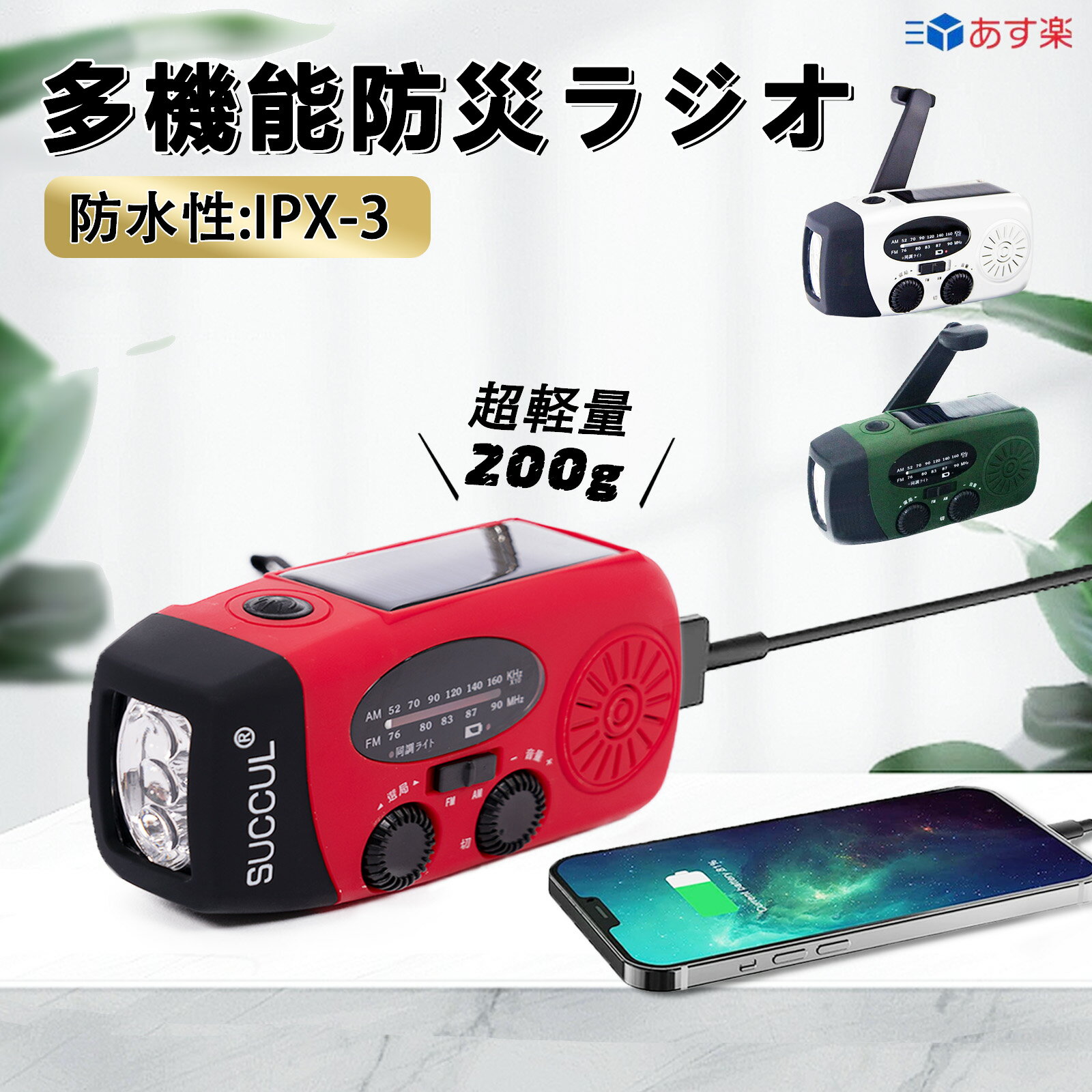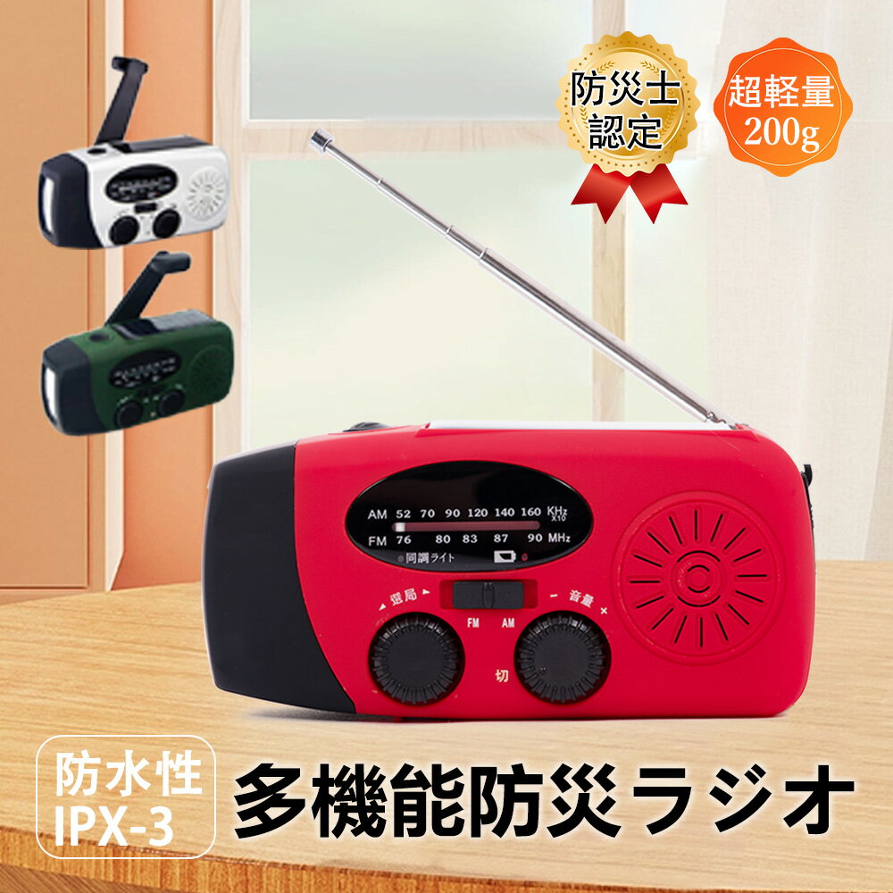 メーカー希望小売価格はメーカーサイトに基づいて掲載しています FM/AM/防災ラジオ 信号受信:AM 520-1710Khz / FM 76-90Mhz。 防水性:IPX-3 台風、津波、地震、停電など災害を防ぐための緊急対策ラジオです。このラジオライトは、停電、電気通信の不安定または中断された場合に、外界からの災害情報を収集可能。緊急時、救援者は迅速に位置を特定する可能。 高輝度懐中電灯 高輝度3つのLEDライトを内蔵された充電式ライト、備えておくと安心なライトです。 外装全体は明るくの赤、光不足の場合も目に立ちます。 モバイルバッテリー 2000mahバッテリーを内蔵され、モバイルバッテリーとしても使用可能。緊急時に携帯電話などUSBグッズに携帯充電器などとして充電可能。 3つの充電方法 手回し充電手回しラジオ:製品の背面にあるハンドルを回すと充電可能。ソーラー充電ラジオライト:ソーラーパネルを日差しの方向に向けると、自動的に充電可能 USBケーブルで充電:付属しているUSBケーブルでUSBポートから充電可能 小型・超軽量 12.8cm * 6cm * 4.5cm 重量200g!緊急時に持ち運びやすく、収納しやすい。 完全防水ではないので、水に浸すことはいけません新規お友だち登録で 今すぐ使えるクーポン※上記のクーポンと併用不可 店舗内全商品対象 5%OFF ↓ ↓ ↓ ↓ ↓