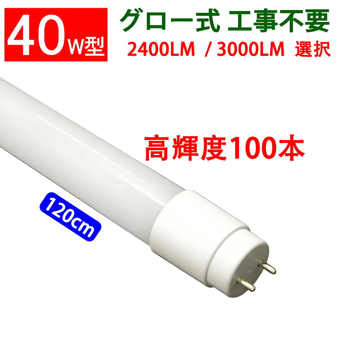 こちらの商品は100本セットになります LED蛍光灯 40W型 120cm 高輝度タイプ 【製品仕様】 口金:G13(蛍光灯タイプ) 電圧:85V〜250V,50/60Hz 消費電力:18〜21W 全光束:2400LM / 3000LM サイズ:最大直径28mm、最大長さ1198mm 色温度:昼光色(5500K~6500K) ,昼白色(5000K) 選択 カバー:乳白カバー ディフォルト材質:PCプラスチック ※ガラスタイプも選択できる 発光角度300度 ※使用上の注意 ・お使いの器具がグロースターター式の場合は、工事不要でグロー球を外すだけで使用できます。 ※グロー式器具でも、両側バネで押さえるタイプは接触不良による故障が多発あり、直結工事して使用が必要、またはガラスタイプを勧め ・グローランプの付いていないラピットスタート方式、インバーター(電子安定器)方式の場合は直結工事が必要ですので電気工事店にご相談ください。 <保証について> LED商品の使用寿命一般的に長寿命ですが、 使う環境により異なりますので、 初期不良対応のみとさせていただきます。 ◆注意事項◆ ・全品チェックして発送していますが、万が一、不良と思われるものがあった場合は点検・交換いたします。 ・輸入商品につき、輸送などのキズがある場合があります。 ・装着して点灯しない場合は左右を入れ替えて装着してください。ピンがちゃんと接触しているかも確認してください。 ・取付・取外しは必ず電源を切った状態で行なってください。 ・お使いの器具がグロースターター式の場合はグロー球を外してください ・ラピットスタート、インバーターの場合は直結工事が必要ですので電気工事店にご相談ください。 ・お使いの照明器具の仕様がわからない場合は、専門の電気知識がある業者や人にご相談ください。必要な工事を行なわず破裂や発火が発生した場合、弊社は一切の責任を負いません。 ・同じ器具で従来の蛍光灯とLED蛍光灯は併用しないで下さい。 ・お風呂場や屋外にて使用するときは雨・水に濡れないようご使用ください。 ・直流電源では絶対に使用しないでください。 ・点灯中・点灯直後は直接手でふれないでください。 ・取り付けの際にはソケットに確実にとりつけてください。 ・水洗いや分解・改造はしないでください。 ・人感スイッチ等の自動点滅装置・遅れ停止スイッチなどには使用できない場合 があります。●グロー式工事不要のLED蛍光灯 40W型 120cm 高輝度タイプ 100本セット 色選択 従来品より照射角度が広くなる、広角300度の最新モデルです、100本セットです 器具がグロースタータ方式なら配線工事不要。グローランプを外すだけでLED蛍光灯が使える ※グロー式器具でも、両側バネで押さえるタイプは接触不良による故障が多発あり、直結工事して使用が必要、またはガラスタイプを勧め 【お得なまとめ買いセットはこちら!】 ■主な特徴 ●高輝度タイプ:通常品に比べ明るさがアップしています ●乳白色LED蛍光灯:通常の蛍光灯と同じ乳白色カバータイプで自然な雰囲気 ●点灯遅延無し:寒冷地でも、電源オン時にパッと点灯します ●通常の蛍光灯よりはるかに長寿命:通常の蛍光灯の約4〜8倍長寿命。 ●電気代が40%OFF:通常の蛍光灯の60%の消費電力で、電気代が大幅に節約できます ●発熱量が少ない:LEDは発光効率がいい、発熱量が少ない、また、赤外線や紫外線もほとんど含まない ●環境に優しい:LEDは水銀を含まないため有害な物質を排出せず、環境にやさしいエコな照明器具です ●割れにくい安全性:素材がガラスではないので、落下しても割れにくい安全性 従来LED蛍光灯より発光角度が広い、300度です ■使用上の注意 グロー球を外さないとLED蛍光灯が一瞬で壊れる恐れがあり、この場合は保証対応できません グローランプのないインバーター(電子安定器)方式、ラピッドスタート方式にはそのまま交換でご利用できません。 その際は直結配線工事をすることによってご利用になれます。必ず器具の方式をご確認下さい。 直結工事の結線方法は以下の図を参考にして下さい →グロー球が無い照明器具で工事不要・そのまま取付可能なタイプはこちら←