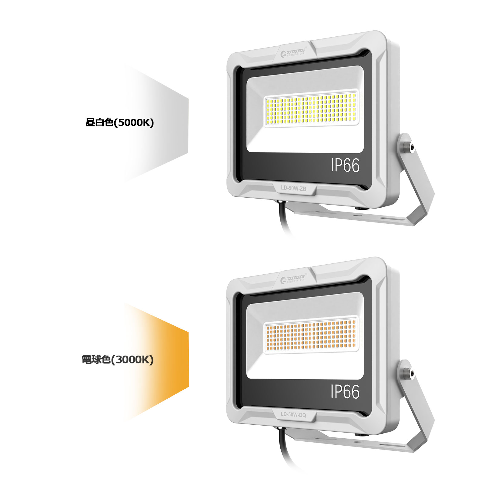 LD50W-ZBメーカー希望小売価格はメーカーサイトに基づいて掲載しています LD50W-DQメーカー希望小売価格はメーカーサイトに基づいて掲載しています おすすめポイント ●高演色LEDチップを144個使用!120°の広角照射で広範囲まで光が届きます ●背面は櫛型フィンによる放熱・対流設計で放熱性能UP ● 底部には通気弁があり、湿気が入りにくく内部の湿気が溜まりにくいため長寿命につながります ● 防水防塵等級IP66!屋外での使用も可能!電源ケーブル約5M、アース線付で安全 ●ガレージ、家庭用物置、公園、駐車場、店舗、屋外屋内、運動、夜間、施設照明、ハウス、整備室、工場、倉庫、作業場、サッカー、野球、テニス、工場現場等様々な分野に活躍できます! 商品仕様 商 品 名 LED投光器 商品番号 LD50W-ZB/LD50W-DQ JAN(GS1)コード LD50W-ZB:4571461862996、LD50W-DQ:4571461862989 LEDパワー 50W 全光束(明るさ) 約7300lm(光源の値に準ずる) 演色数 >Ra80 コード 約5m 照射角度 約120° 色温度 昼白色(5000K)、電球色(3000K) 光源数 LEDチップ×144個 ステー調節角度 約180° 防水等級 IP66 サイズ W231*H181*D70mm 質量 約2.65kg(本体) 材質 灯体:ADC12アルミニウム+ガラス;ステー:鉄 セット内容 投光器本体、保証書、取扱説明書 商品仕様書類 仕様図 注意事項 ※製品の改善・改良などのため、予告なく製品の仕様変更を行うことがありますので、ご了承ください。 ※大量注文の際には最適価格にて御見積の御用意致します。当店へメールの御問い合わせも大歓迎!!★オススメポイント★ ■高演色LEDチップを144個使用!120°の広角照射で広範囲まで光が届きます ■背面は櫛型フィンによる放熱・対流設計で放熱性能UP ■底部には通気弁があり、湿気が入りにくく内部の湿気が溜まりにくいため長寿命につながります ■防水防塵等級IP66!屋外での使用も可能!電源ケーブル約5M、アース線付で安全 ■ガレージ、家庭用物置、公園、駐車場、店舗、屋外屋内、運動、夜間、施設照明、ハウス、整備室、工場、倉庫、作業場、サッカー、野球、テニス、工場現場等様々な分野に活躍できます! ●例えばこんな使い方・・・・・ ●商品や建造物のライトアップに・・・・>Ra80+広角120度に広がる光で広範囲を照射し、鮮やかに照射物を照らします。 ●スポーツ競技用施設に・・・・・・・・体育館や運動場などにスポーツ競技施設などに最適です。 ●小~中型駐車場などに・・・・・・・・小~中型駐車場などの設置にも最適です。