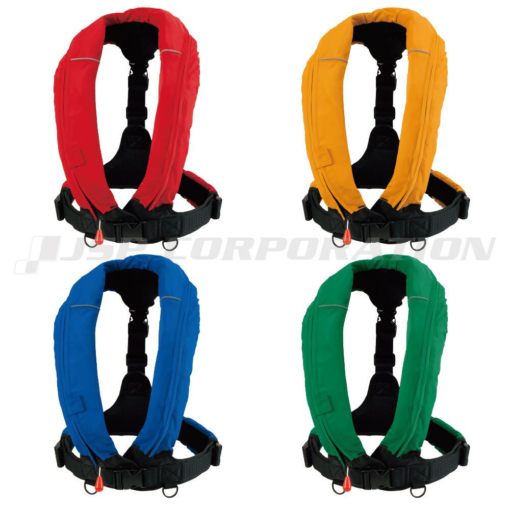 首掛け型ライフジャケットです。作動索を引き膨らませる他に、落水時、水に反応し自動で膨脹する機能が付いています。一方で、不意の雨等の予期せぬ水濡れには反応しにくいように設計しています。一度膨らませても、ボンベとスプールを交換することで繰り返し使用することができます。交換もとても簡単に、ご自身で行えます(交換の際は別売の専用ボンベセット[BS-27A]をご購入下さい)。ボンベやスプールの使用状態は、取り付け部分を一目見るだけで確認できます。用途港湾工事用。海難事故防止に。国家検定合格品型式承認番号第5326号 浮力11.1kg サイズフリー(ウエスト最大125cm) 外装布素材ナイロン 気室布素材ナイロン/PU材質本体: ナイロン質量・質量単位640g