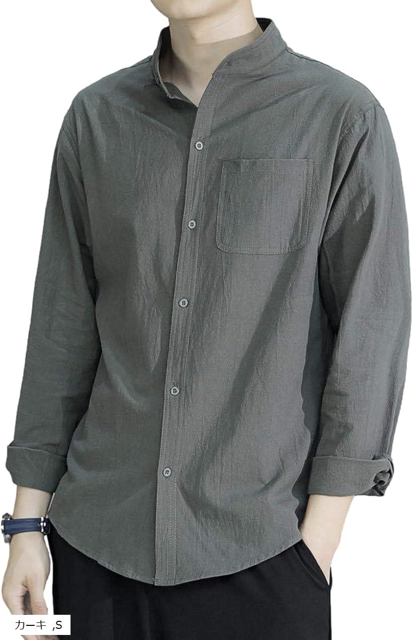 スタンドカラー ベーシックシャツ きれいめ カジュアル 長袖 メンズ カーキ S (カーキ, S)