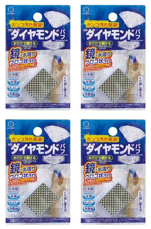 小久保工業所 鏡の掃除用スポンジ (トイレ/鏡/洗面台に) 32×25×14mm SDダイヤモンドパフ 水垢おとし (繰り返し使用可能) 5166 4個セット【水アカ落としにピッタリなダイヤモンドパフ】人工ダイヤモンドを配合した水周り専用のクリーナーです。水につけて汚れた箇所をこするだけで、人工ダイヤモンドの強い研磨力により、お風呂場などのガンコな水垢落としにピッタリな商品です。【ウロコ汚れ、水垢掃除に】浴室・トイレ・洗面台などの鏡や衛生陶器の水アカ、ウロコ状汚れのお掃除に。プチプライスなのに繰り返し使えて、コスパ良好 浴室、トイレ、洗面所など必要な場所に置ける、お得な4個セットです。【ご使用方法】(1) 使用箇所の汚れが付いた部分をよく水でぬらしてください。 (2) 本品の研磨面 (柄面) を水にぬらし、軽い力で少しずつこすってください。(3) 最初ザラザラした感触がありますが、その感触がなくなるまでこすってください。 (4) 浮き出た汚れは水でよく洗い流し、乾いた布などで水分を拭き取ってください。(5) 使用後はよく洗って、水気を切って乾燥させてください。【使用できない物】曇り止め加工・撥水加工などのコーティング加工された、鏡・ガラス・スリガラスなどの特殊加工ガラス、樹脂製品、塗装面、車、メガネ、レンズ、硬質な石材。長期間放置し経年変化した汚れや、化合物、浸透した油膜、水質などの諸条件により、全ての汚れが落とせるものではありません。キズつきが気になる場合は、必ず目立たない部分で試してからご使用ください。【仕様】サイズ:3.3×2.5×1.5 (cm) / 本体重量:4.54 g【材質】研磨部:ポリウレタン、ポリエステル、人工ダイヤモンド、エポキシ系樹脂 / スポンジ部:ポリエチレン / 耐熱温度:約60 度 / 原産国:日本 / セット内容:4個セット