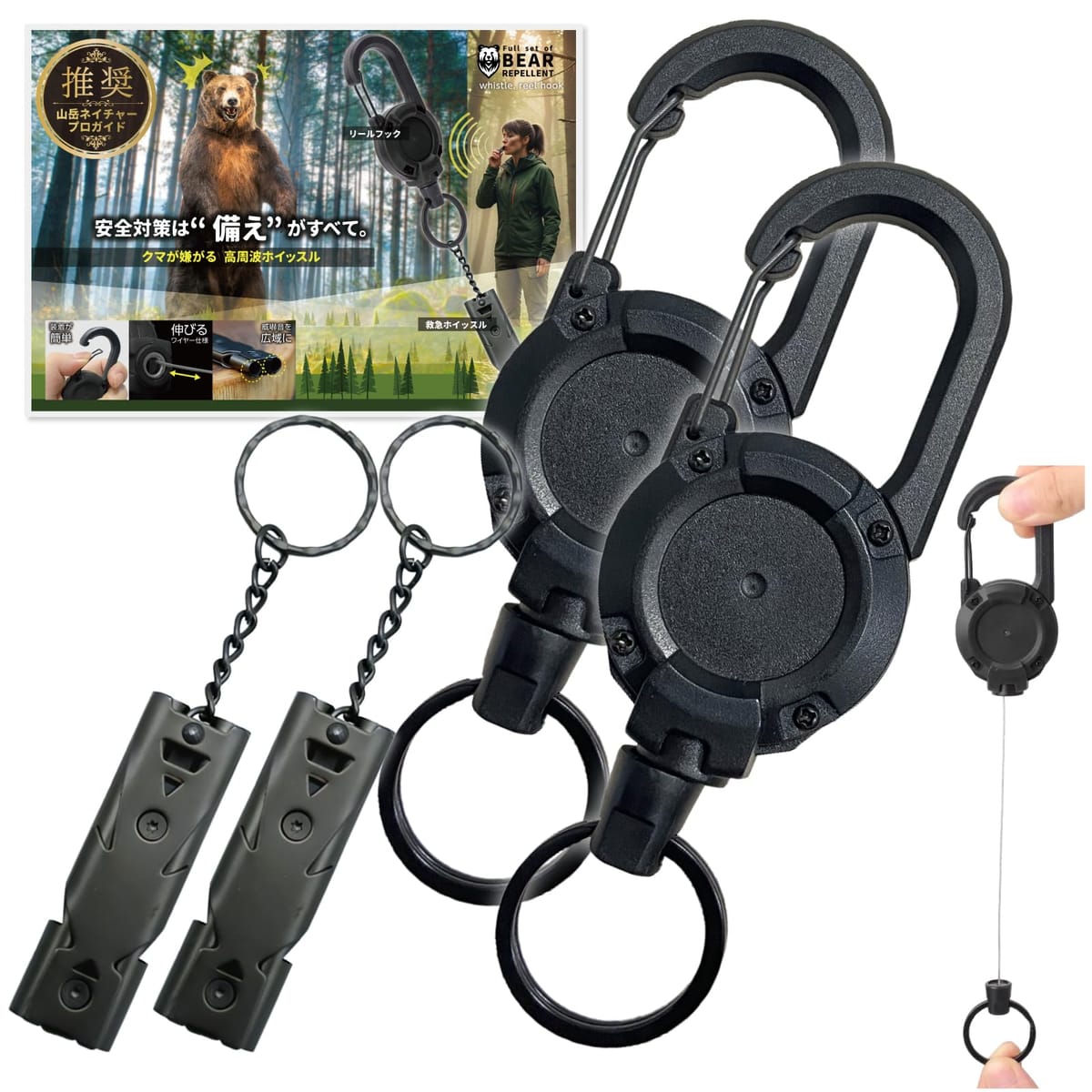 山岳ネイチャープロガイド推薦推薦・リールフック付 熊よけホイッスル 防災グッズ アウトドア 登山用 単品セット (ブラック)