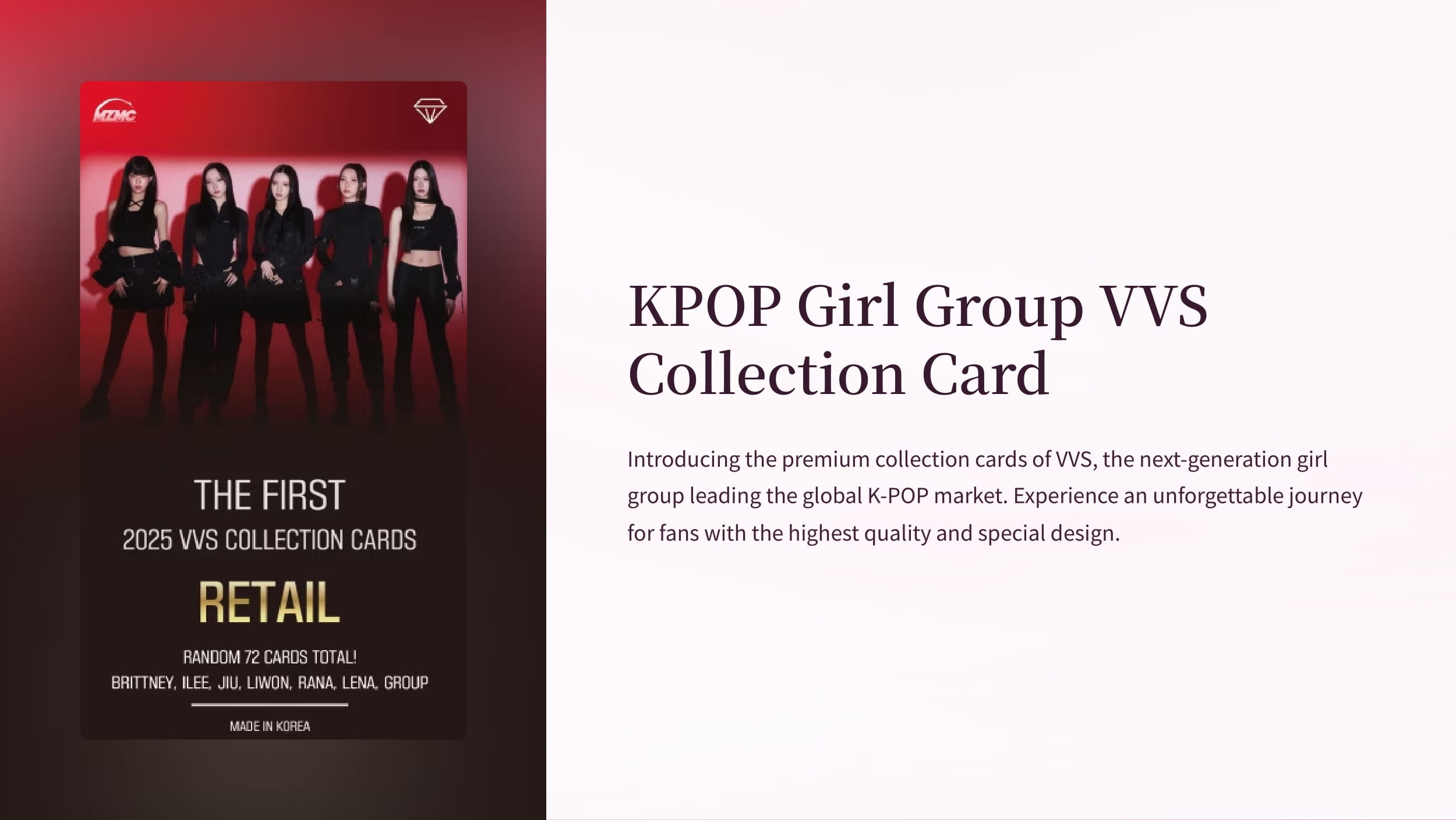 Topbreaker社から、MZMC公式トレーディングカード ホビー「VVS」の2025年が初登場! 次世代グローバルK-POPを牽引するガールズグループ・VVSのプレミアムコレクションカードが登場! 最高品質と特別仕様で、ファンに忘れられない体験を! ★リテールボックス開封ヒット ◇直筆サイン:2ボックス1枚 ★ハイライトコンテンツ ベース パラレル⇒ ブラック・ブロークン1/1、ゴールド/20、レット/330 直筆サイン パラレル⇒ ブラック・ブロークン・インスクリプション1/1、レット・ブロークン・インスクリプション/10、 ゴールド・オート/20、レット・オート/50、ベース・オート/99、セルフィーオート (SP)、 トレカジャーナルのコラムはこちら 仕様:1パック=3枚入り、1ボックス=24パック入り、1カートン=50BOX 発売元:Topbreaker ◆1ボックスで全種類は揃いません。 ◆商品構成・仕様に関しましては、現在制作中の為、予告なく変更になる場合がございます。 ◆封入率に関する情報は生産数に対する割合でありボックス内の出現率を保証するものではありません。 ご注文されるお客様へ ◆商品の特性上、ご注文後のキャンセルは原則として承っておりません。 ◆発売日が異なる商品を同時にご注文いただいた場合は、すべての商品が入荷次第、まとめて発送いたします。 ◆メーカー都合により入荷数が変更される場合がございます。その際は、ご予約の先着順にて発送、またはご予約のキャンセルとさせていただく場合がございますので、予めご了承ください。 ◆商品発売日はメーカーが提示した目安であり、予告なく延期または中止となる場合がございます。 ◆予約受付開始日および再入荷日は未定です。お問い合わせいただいても回答はできかねますので、ご了承ください。 ◆カートン入り数分のご購入については、可能な限り未開封状態での発送を行いますが、在庫状況によりご希望に添えない場合がございます。予めご了承ください。 ◆在庫は常に変動しておりますため、具体的な在庫数についての個別のお問い合わせにはお答えできかねます。 ◆ご住所の変更をご希望の場合は、できるだけお早めにご連絡ください。タイミングによっては対応できない場合がございます。 ◆記載の封入割合は総生産数に基づくものであり、各ボックスやカートン内に必ずしもその比率で封入されていることを保証するものではありません。 ◆商品開封後にミッシングヒットやカード破損などの不備が発覚した場合、メーカー方針により、直接メーカーへお問い合わせくださいますようお願いいたします。弊社では返品・交換の対応はいたしかねますので、予めご了承ください。 ◆パッケージ(シュリンクフィルム)の破損や、軽度な外箱・内部パーツの傷につきましては、不良品には該当せず、返品・交換には応じかねます。