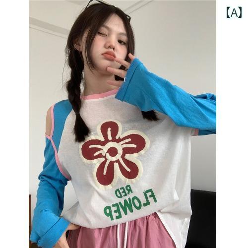 tシャツ レディース おしゃれ カジュアル 韓国 コントラスト オフショルダー フラワープリント スプライシング ラグラン 長袖 ロンt 女性用 夏 薄くて ルーズ ゆったり 日焼け防止 シャツ トップス